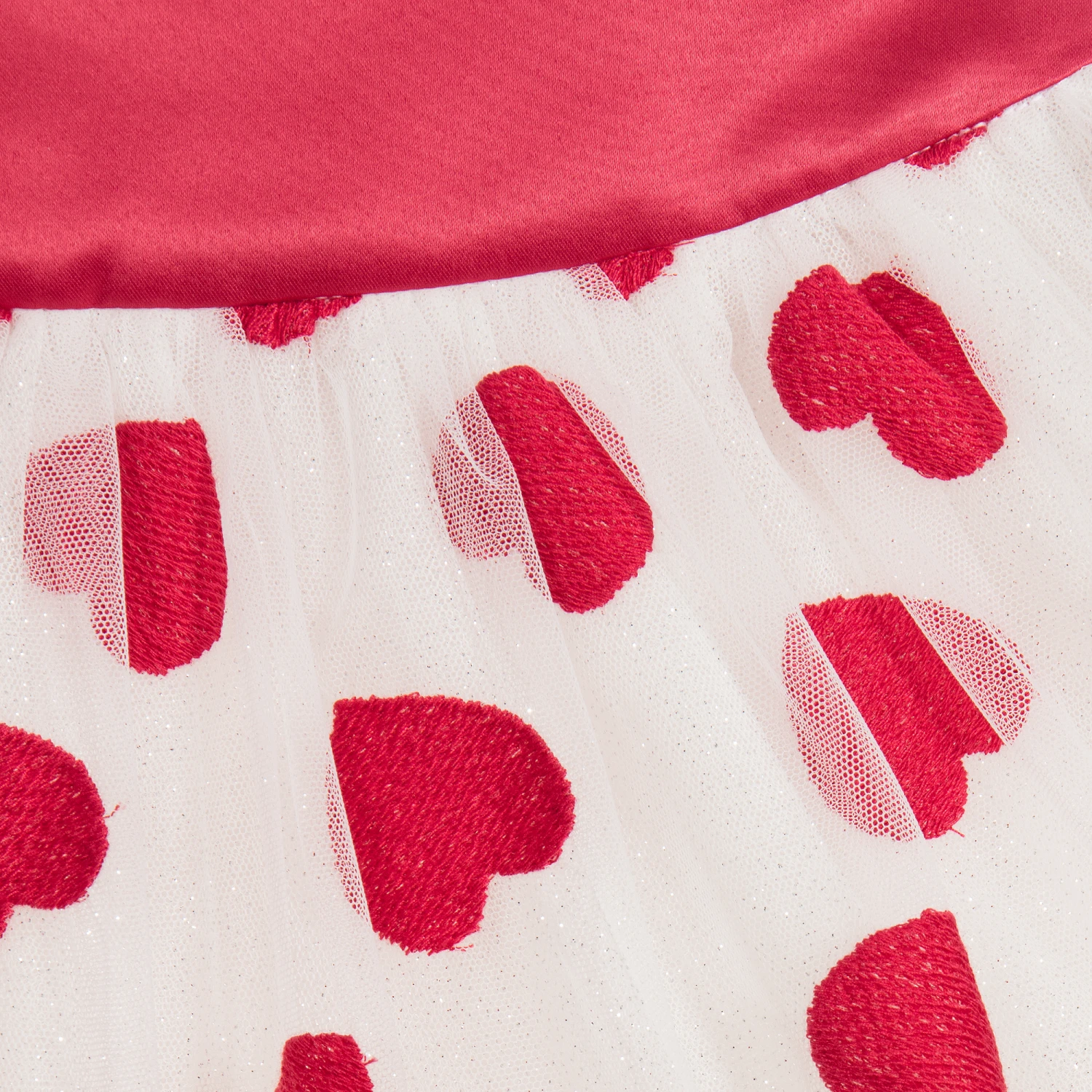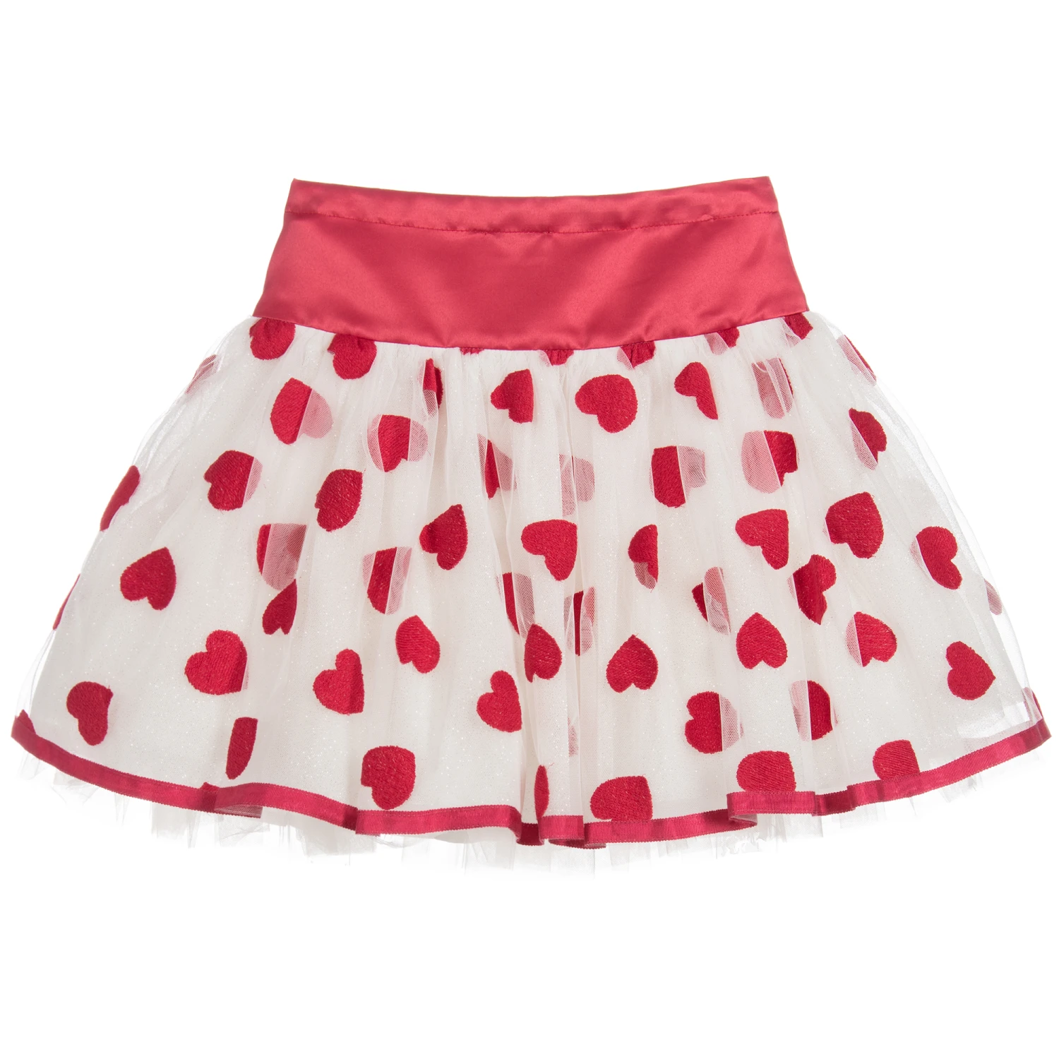 This gorgeous full and voluminous tulle skirt by Monnalisa Chic has a red satin waistband. The top layer of tulle is decorated with embroidered red hearts and has a layer of silver glitter tulle beneath it for a sparkly finish. There are further tulle frills attached to the cotton lining adding extra fullness.