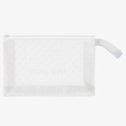 Pale pink swimsuit for girls by Monnalisa, made in soft and stretchy polyester. Fully lined, it has a yellow Looney Tunes™ Tweety bird printed on the front and a strap across the low-cut back. There are super-soft pink mesh ruffles over the shoulders and a silver heart logo charm on the side.