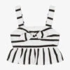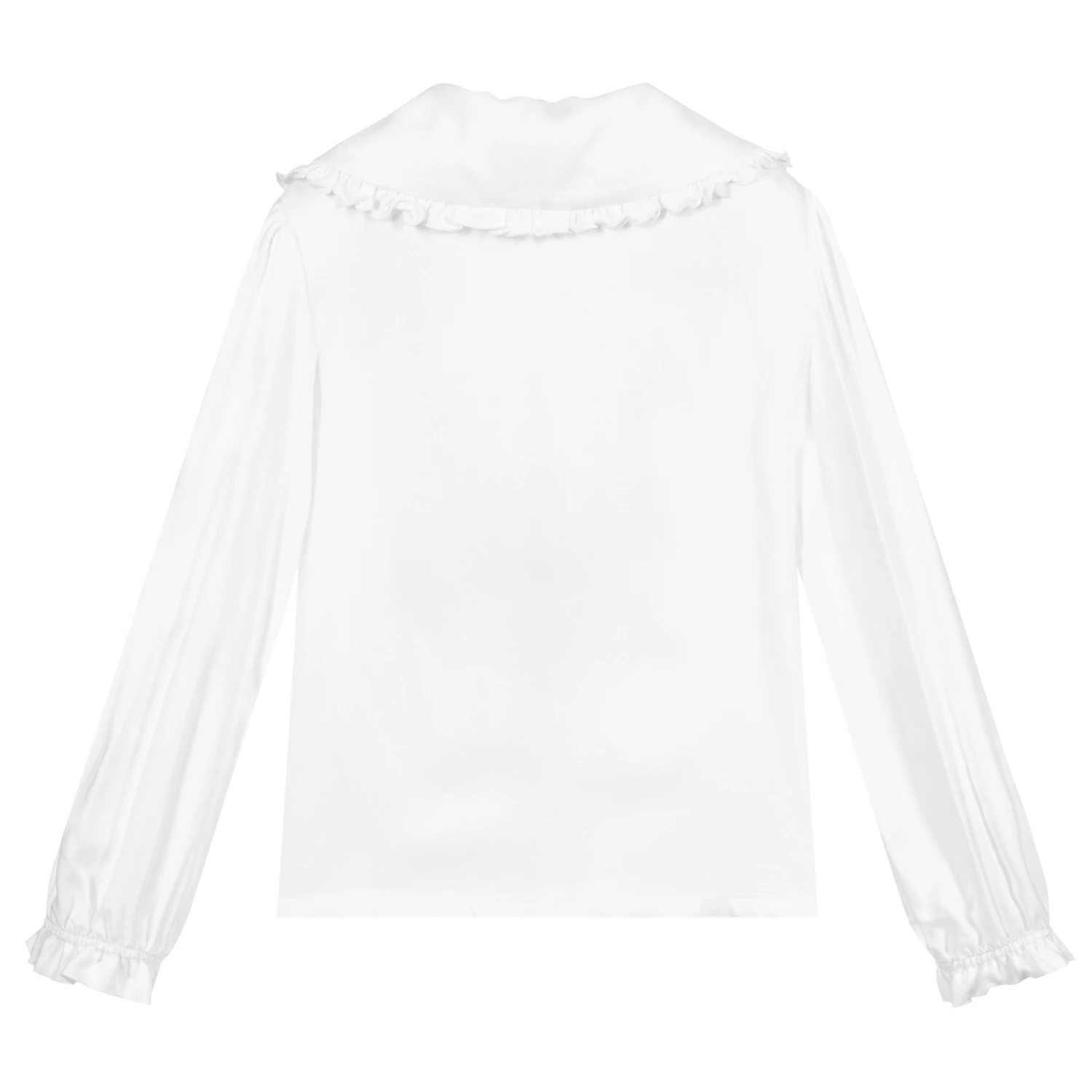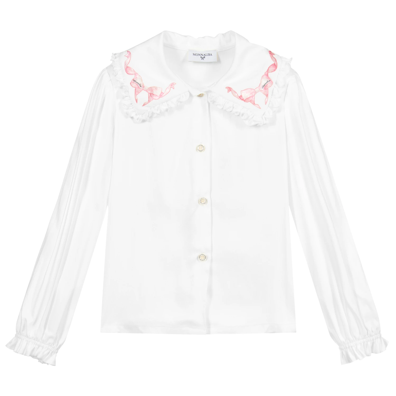 Girls ivory blouse by Monnalisa, with a stylish, ruffled collar and pink velvet bow appliqués. Made in soft and lightweight viscose, it fastens with glittery silver buttons and has elasticated cuffs.