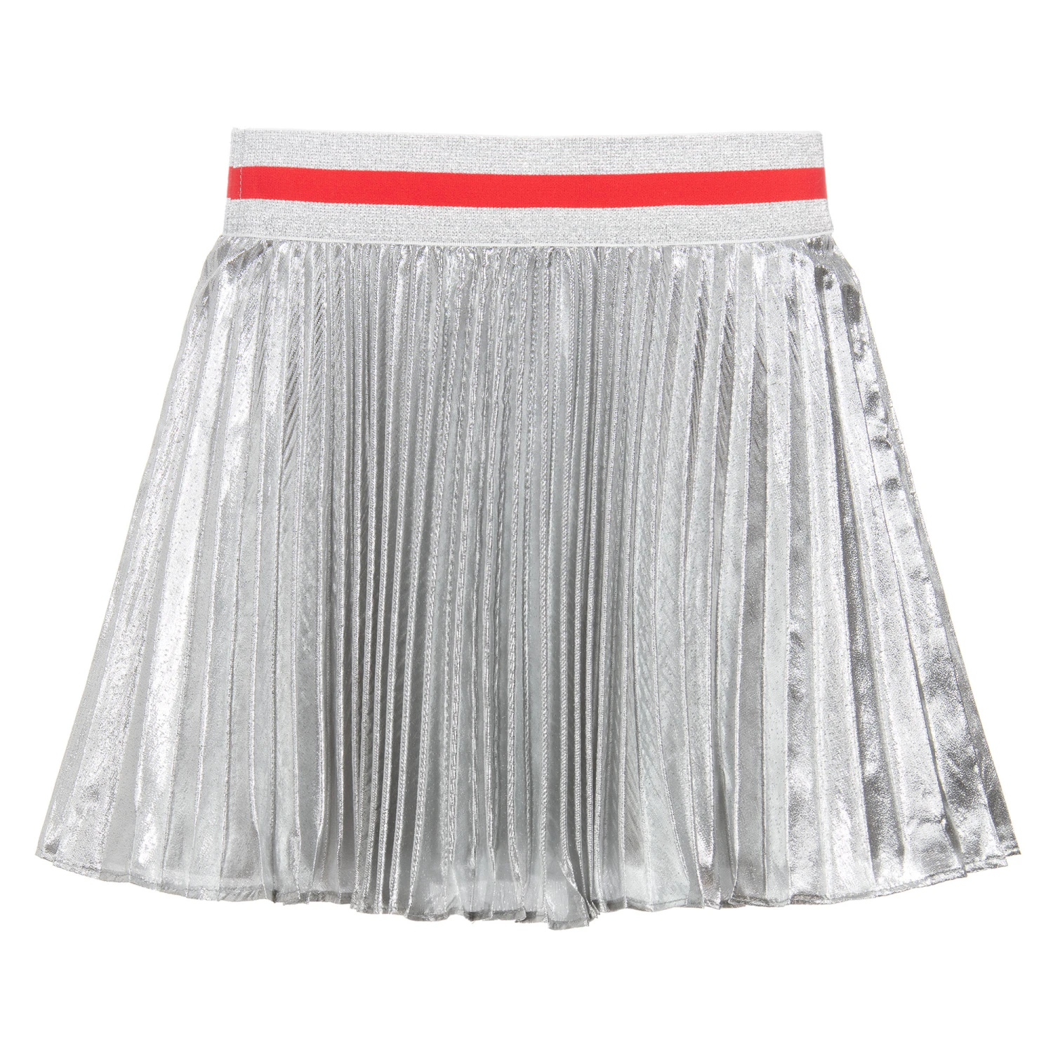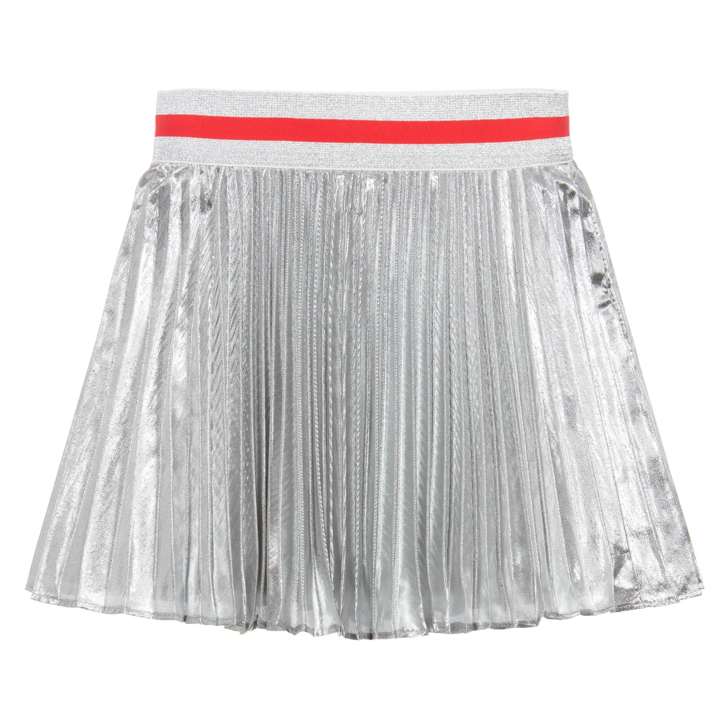 Girls metallic silver pleated skirt from Monnalisa. The waistband is stretchy and elasticated, with a red glitter band in the centre and it has a cotton lining.