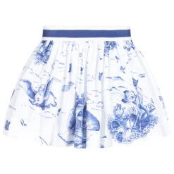 White cotton skirt by Monnalisa, with a beautiful toile de jouy Disney© print in blue. Made in smooth poplin, this pretty design has an elasticated waistband and cotton lining with tulle petticoat trims for added volume.