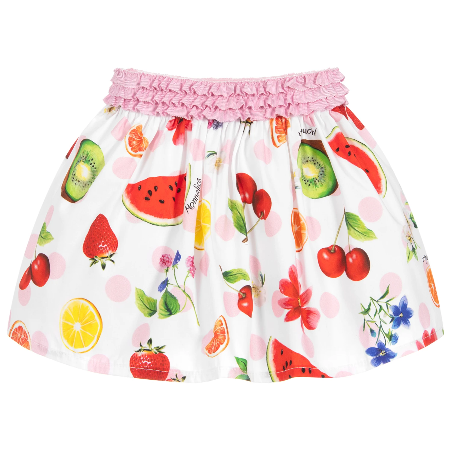 Younger girls white and pink flared skift from Monnalisa, made in soft and lightweight cotton. It has a colourful fruit pattern, with tulle on the lining’s hem for extra volume. The waistband is elasticated, with pretty grosgrain ribbon ruffles.