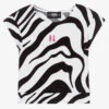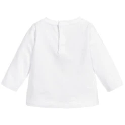 White long sleeve top for younger girls by Moschino Baby, made in soft and stretchy cotton jersey. It has the designer’s name and iconic teddy motif in sparkling diamantés on the front, with popper fastening on the back.