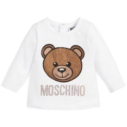 White long sleeve top for younger girls by Moschino Baby, made in soft and stretchy cotton jersey. It has the designer’s name and iconic teddy motif in sparkling diamantés on the front, with popper fastening on the back.