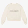 Ivory short-sleeved sweatshirt for girls by Moschino Kid-Teen, made in soft mid-weight cotton jersey. This comfortable top has a fun oversized Moschino Teddy Bear bouclé appliqué on the front, for instant designer appeal. Ideal for relaxed days, it has a casual crew neck and a stretchy ribbed hem.