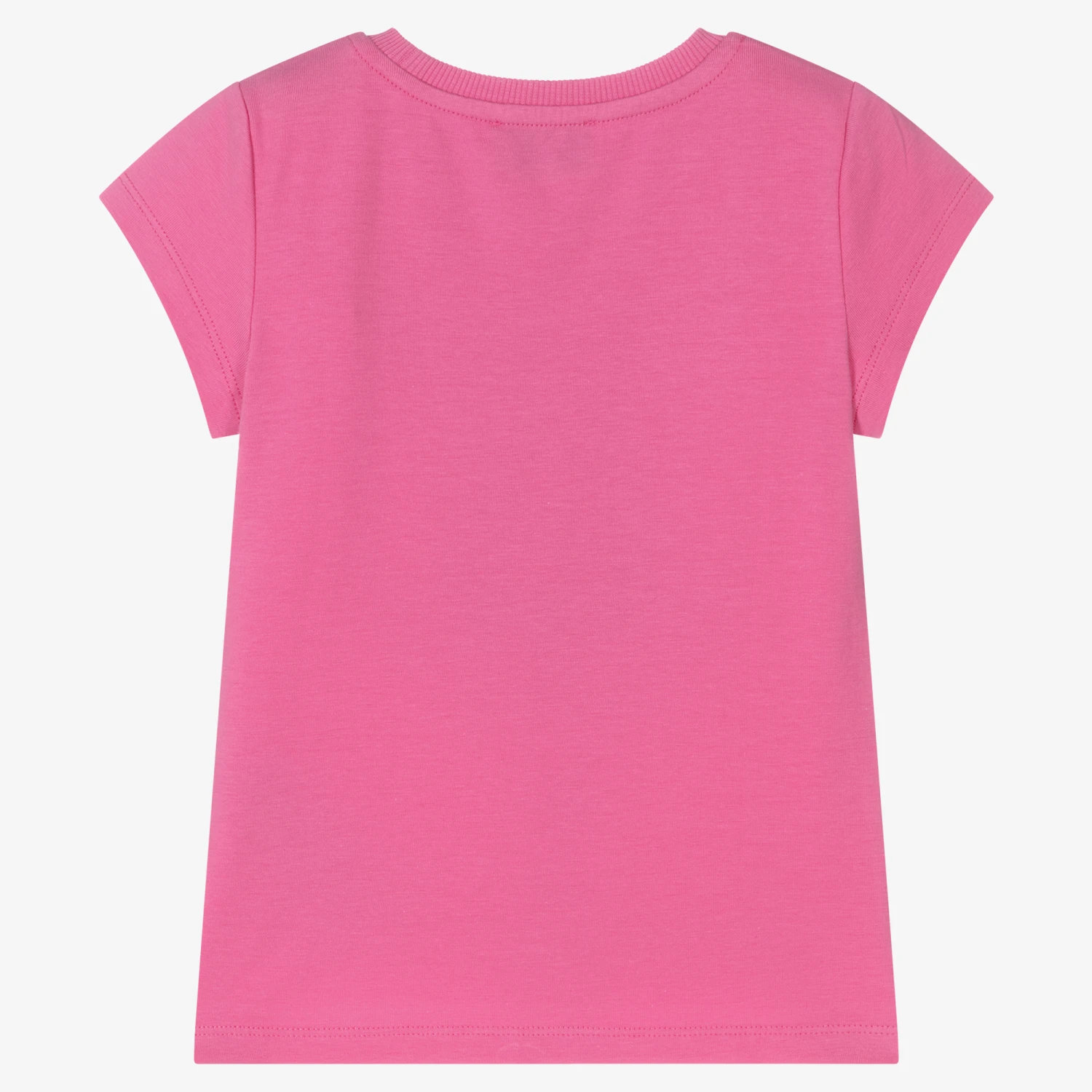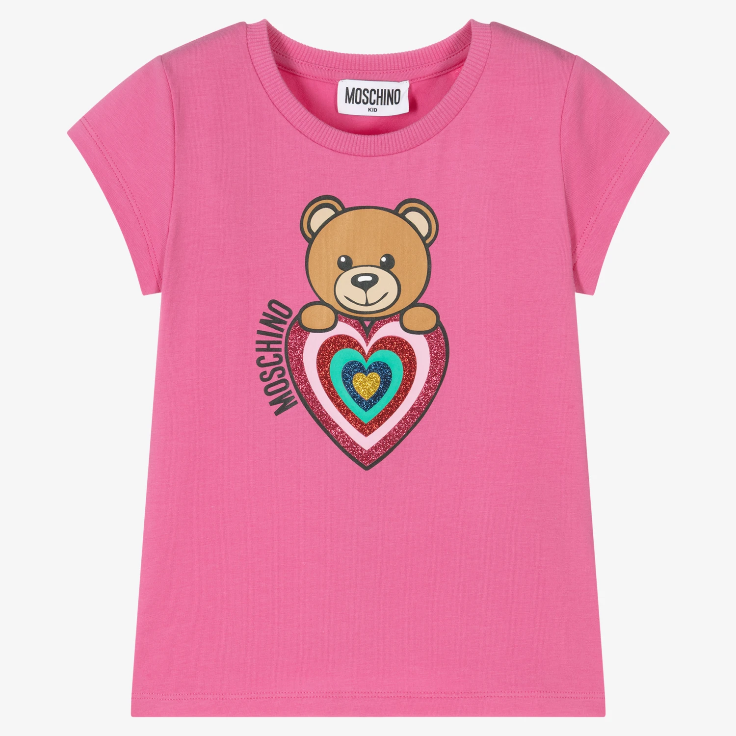 Pink T-shirt for girls by luxury Italian designer Moschino Kid-Teen. The front has the Moschino Teddy Bear printed on the front with a colourful, glittery heart. It is made in comfortable cotton jersey for stylish everyday wear.