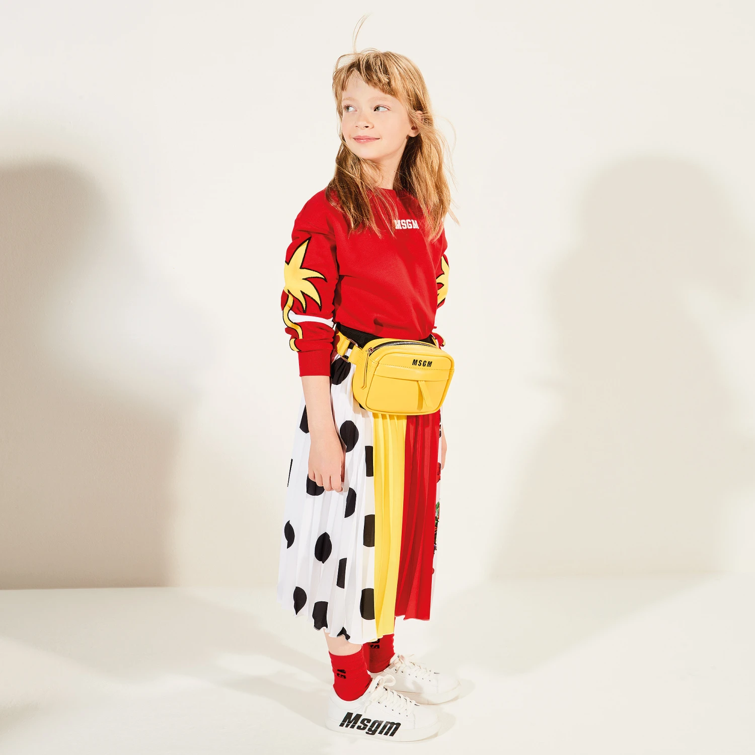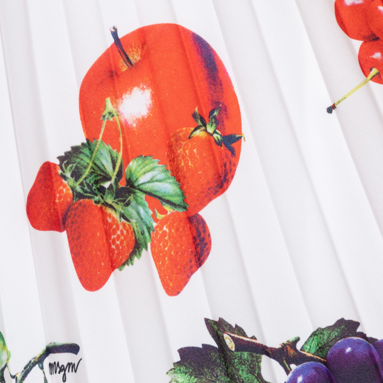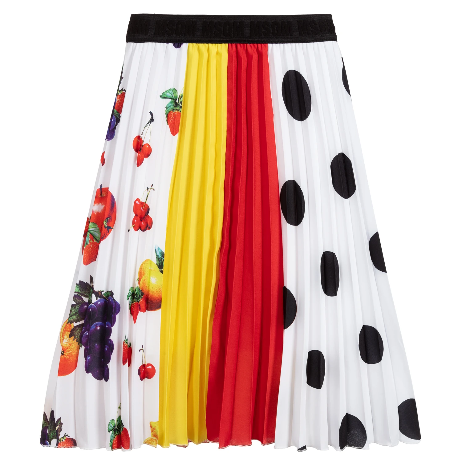 Girls red, yellow and white pleated skirt from MSGM, with a colourful fruit and dot pattern. Made in soft crêpe, it has a black elasticated logo waistband and a lightweight polyester lining.