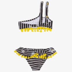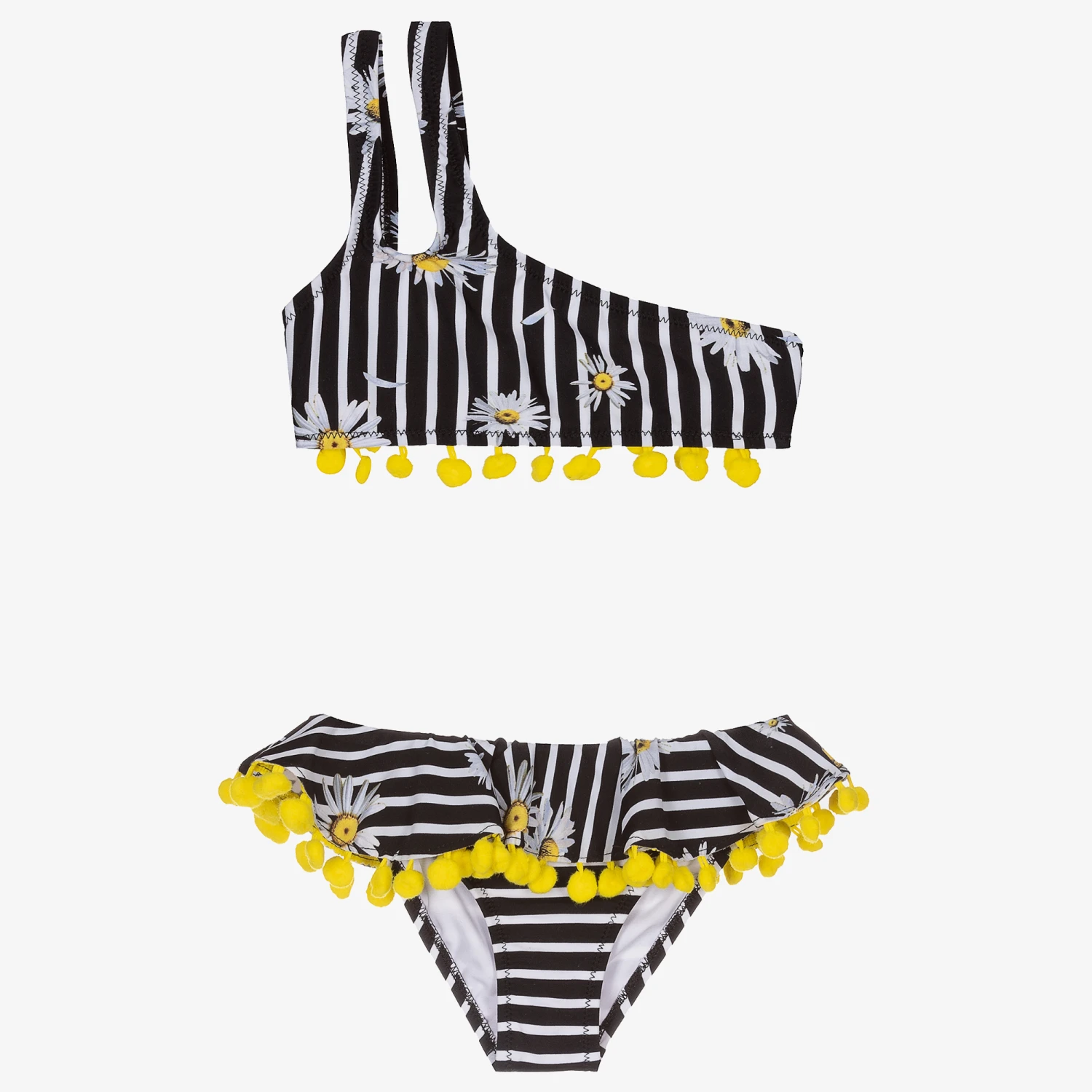 Cute black and white striped bikini for girls by Nessi Byrd, made, and lined, in soft and stretchy nylon with UV50 protection. The set has a sweet daisy print and yellow pom-pom trims. The top has an asymmetric one-shoulder design and the bottoms have a ruffle trim.