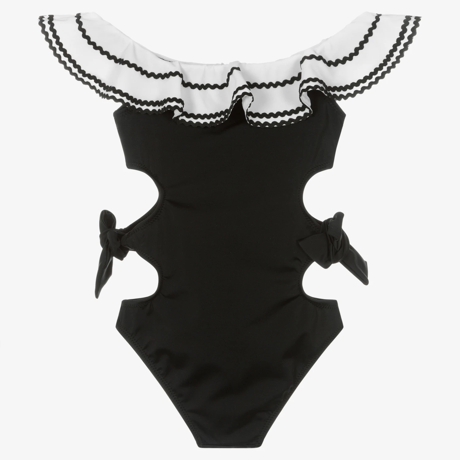 From Nessi Byrd, black swimsuit for girls made in stretchy smooth fabric with UV50. This stylish one-piece has a white ruffle neckline which can be worn off-the-shoulder for a feminine look. It is fully lined for comfort and has cut-out sections on the side for an alterative finish.