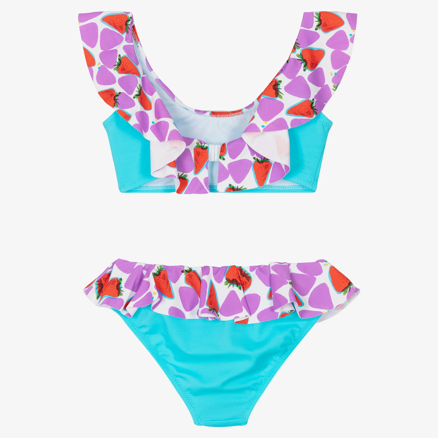 Girls bright blue bikini from Nessi Byrd, trimmed with purple and red strawberry ruffles. Soft, stretchy and lined for comfort, it has UV50 sun protection and the top fastens with a clasp at the back.