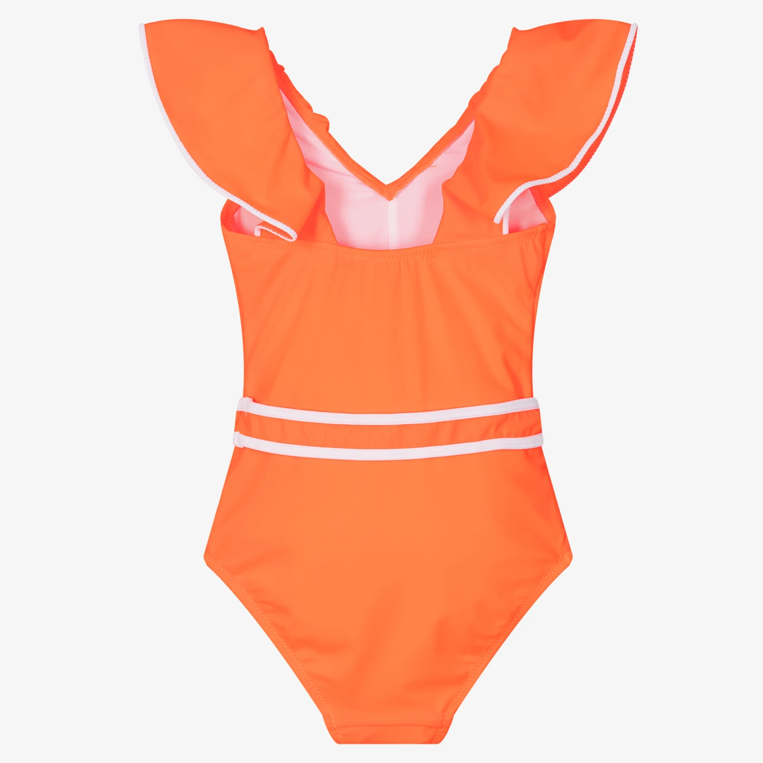 Eye-catching orange swimsuit for girls from Nessi Byrd. It is made in stretchy fabric with UV50 and fully lined for comfort in and around the pool. It has a frill detail on the straps and down the front trimmed in white. A fixed belt with a decorative buckle gives the illusion of a feminine cinched silhouette.