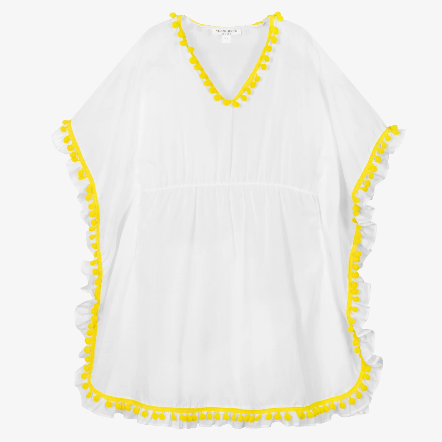Lovely white beach kaftan for girls by American designer Nessi Byrd, trimmed in bright yellow pom-poms. It is made in lightweight voile with a gently elasticated waist.