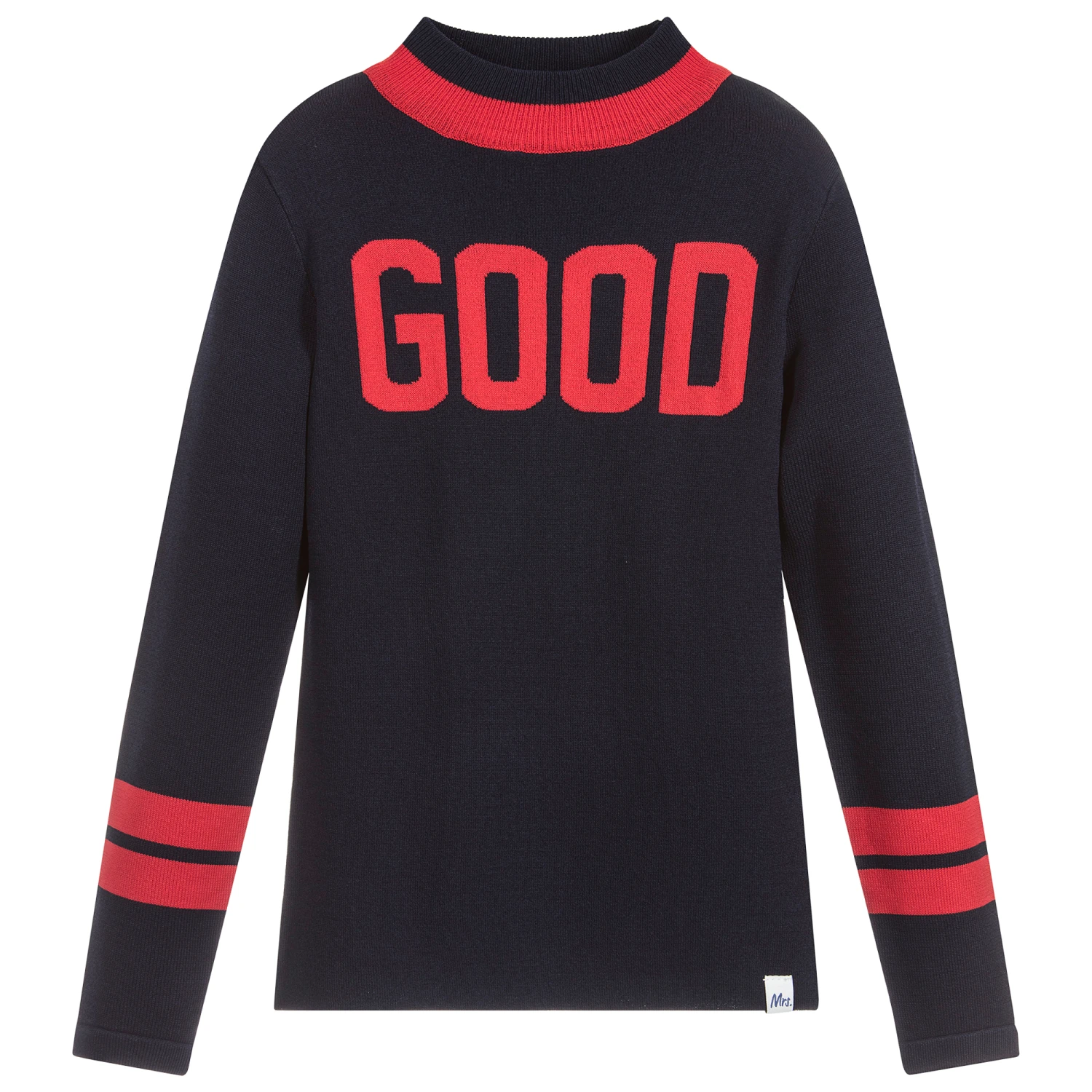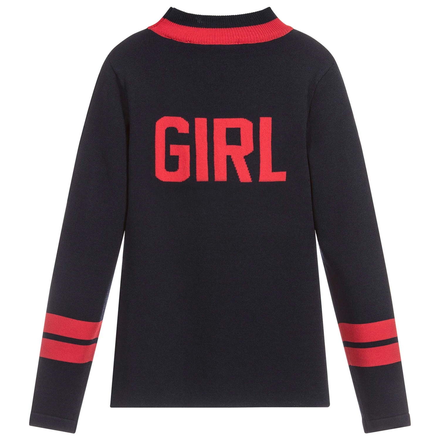 Girls navy blue top from NIK&NIK made in soft mid-weight viscose jersey. It is decorated with red stripes on the neckline and cuffs, with the words ‘good’ and ‘girl’ in bold red letters.