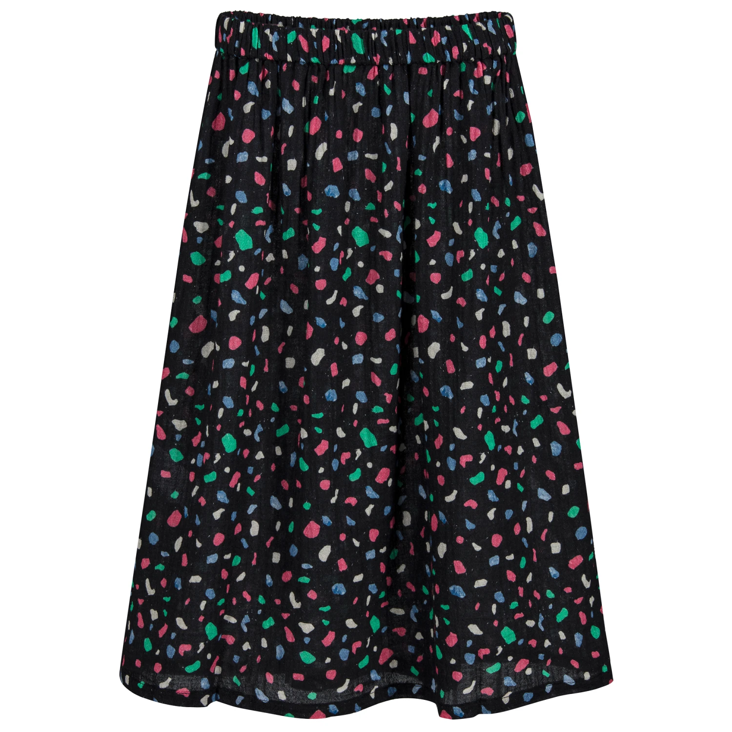 A long, black cotton cheesecloth skirt by Noé & Zoë Berlin, patterned in pink, green, blue and ivory. It is gathered around the waist and is easy to wear, simply pulling up.