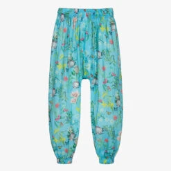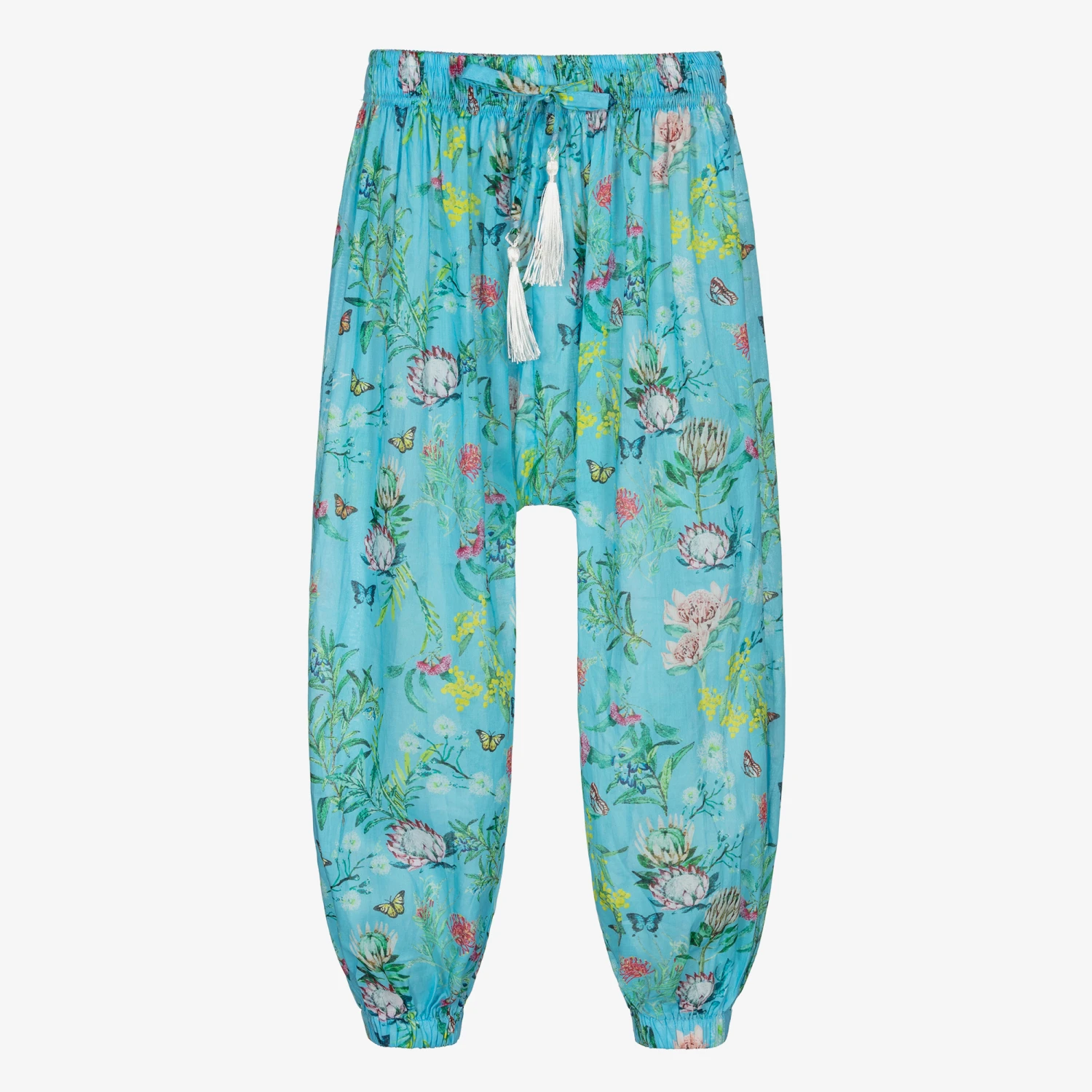 Girls turquoise blue harem beach trousers by Olga Valentine, made in soft and lightweight cotton voile. They have an all-over floral and butterfly print in green, yellow and pink. Loose-fitting, they have an elasticated waistband and ankle cuffs.