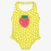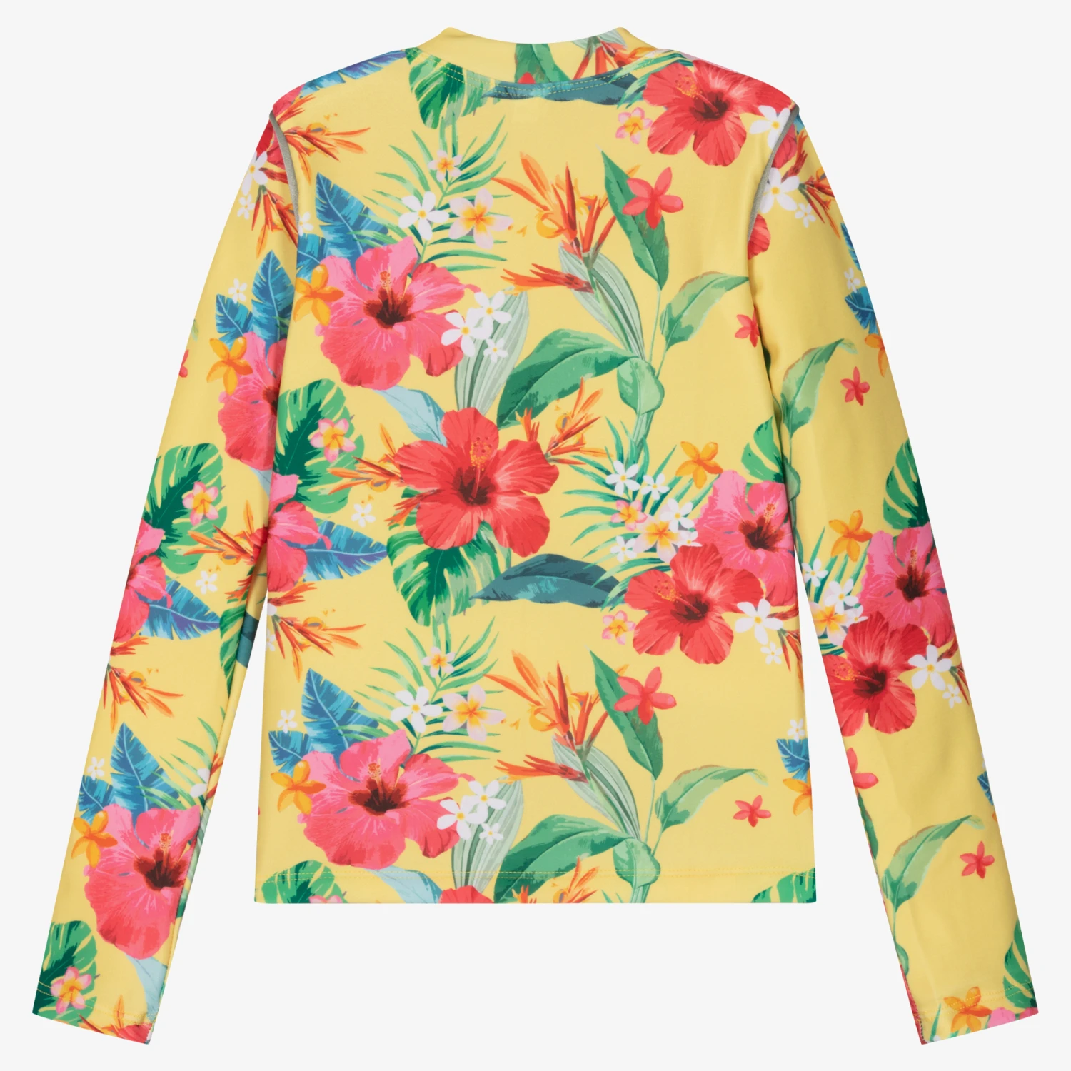 A vibrant yellow sun protective top for girls by Australian swimwear brand Olga Valentine, made from soft and stretchy recycled fabric with UPF 50+. In a tropical pink floral print, this long-sleeved piece has an exposed white zip on the front and metallic silver trims on the shoulders.