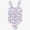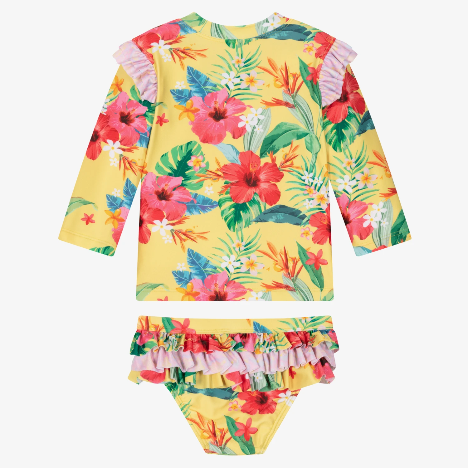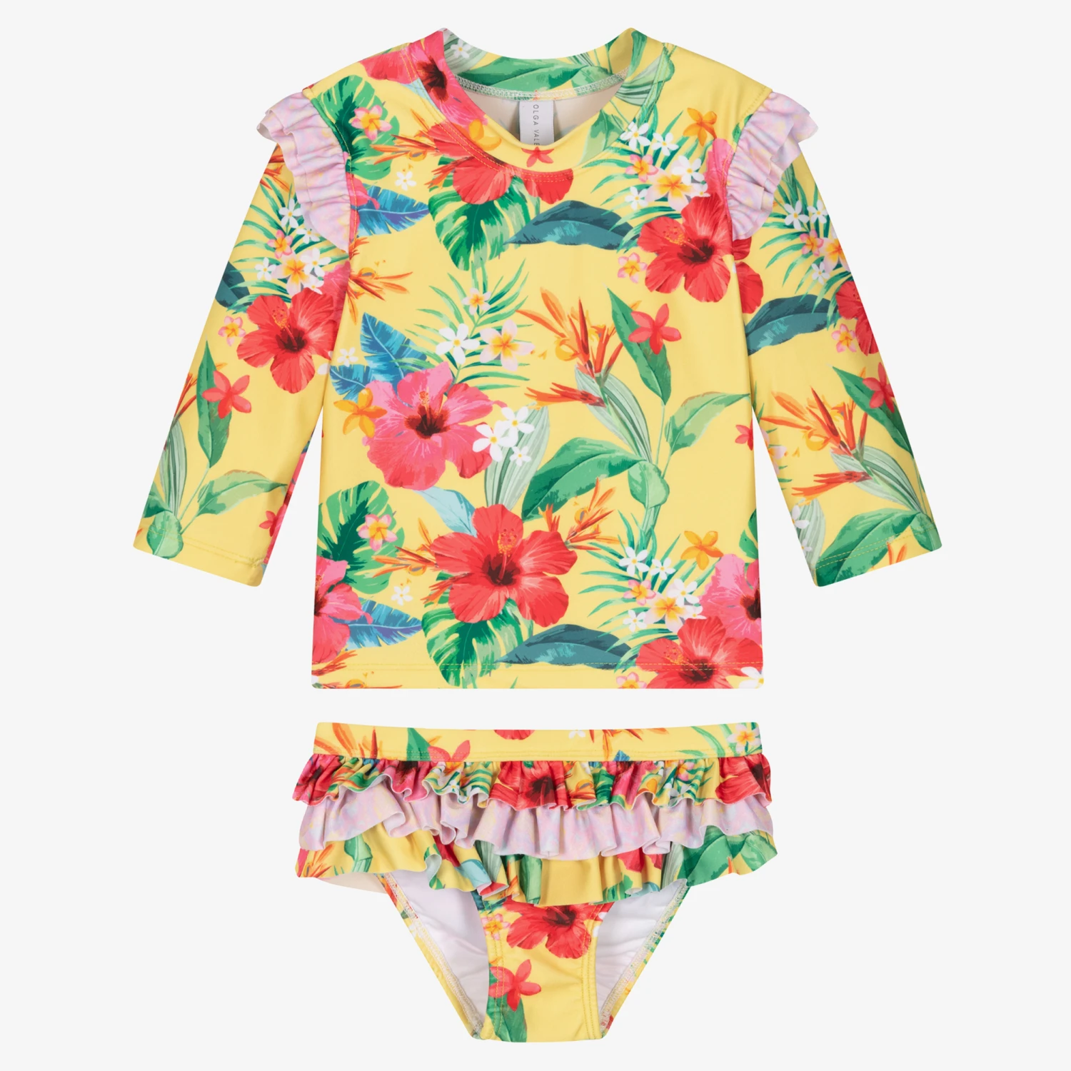 Vibrant yellow swim set for girls from Australian swimwear brand Olga Valentine, designed in a tropical pink floral design. Made in silky stretchy fabric with UPF 50+, the top has three quarter length sleeves and contrasting frills on the shoulders in a pink marble pattern. It is lined on the front for added comfort and modesty. The matching bottoms are fully lined and detailed with a fun ruffle trim on the elasticated waistband. These items are made from recycled Repreve materials.