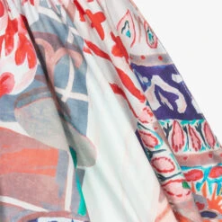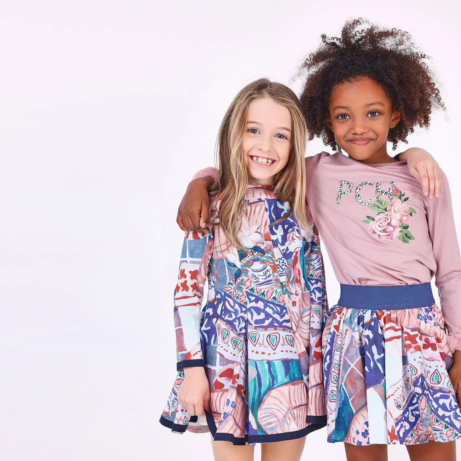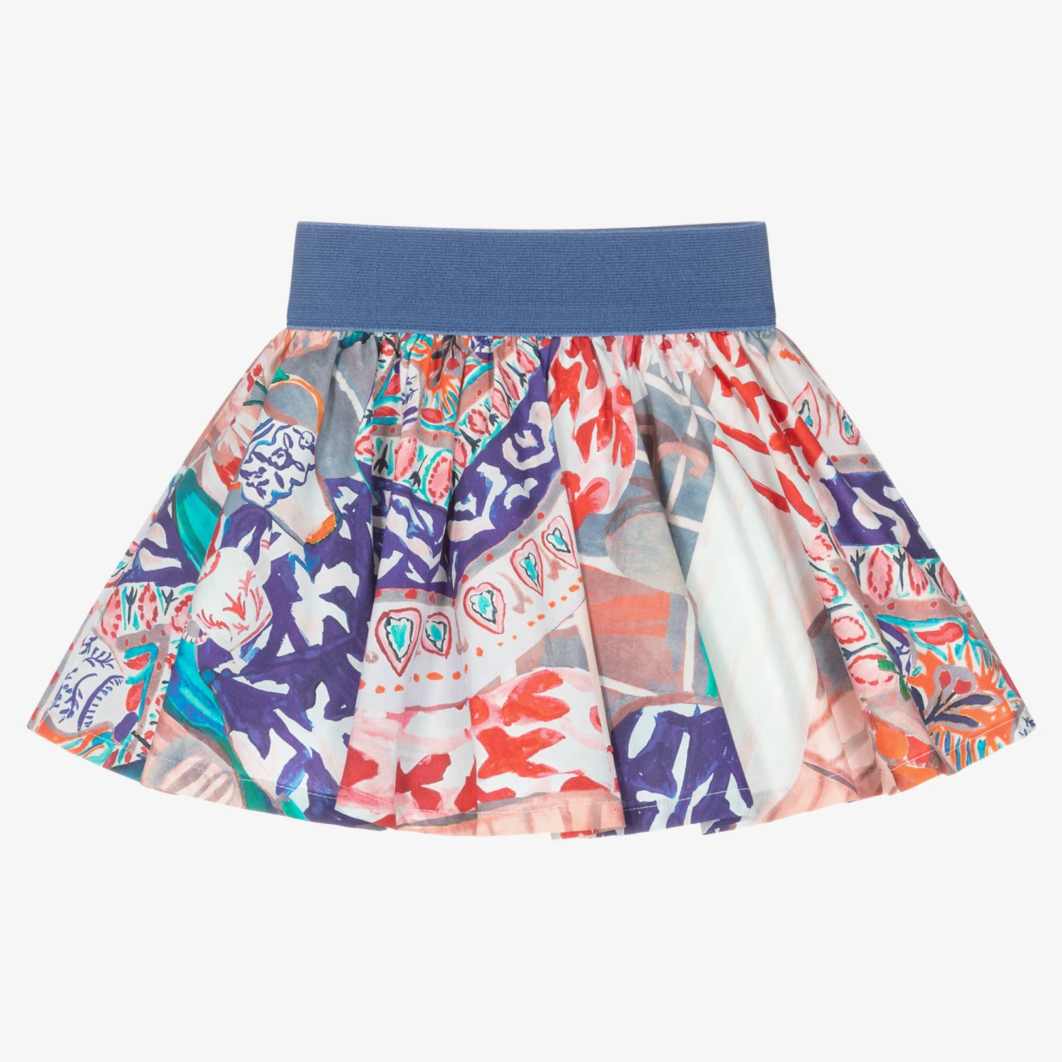 Pretty blue gathered skirt for girls by Pan Con Chocolate, patterned in a gorgeous abstract print in shades of blue, pink, and green. This slip-on style is made in lightweight cotton and has a deep, elasticated, blue waist. It has a gold logo tab above the hem and is lined with soft voile for comfort.