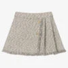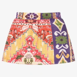 Beautiful red and yellow skirt for girls by Pan Con Chocolate, made in smooth polyester. It has a vibrant abstract print in shades of red, blue, green and yellow, with a gold logo tab above the hem. Lightly padded for warmth and lined in cotton for comfort, it has is an elasticated waist so is easy to wear, simply pulling up.