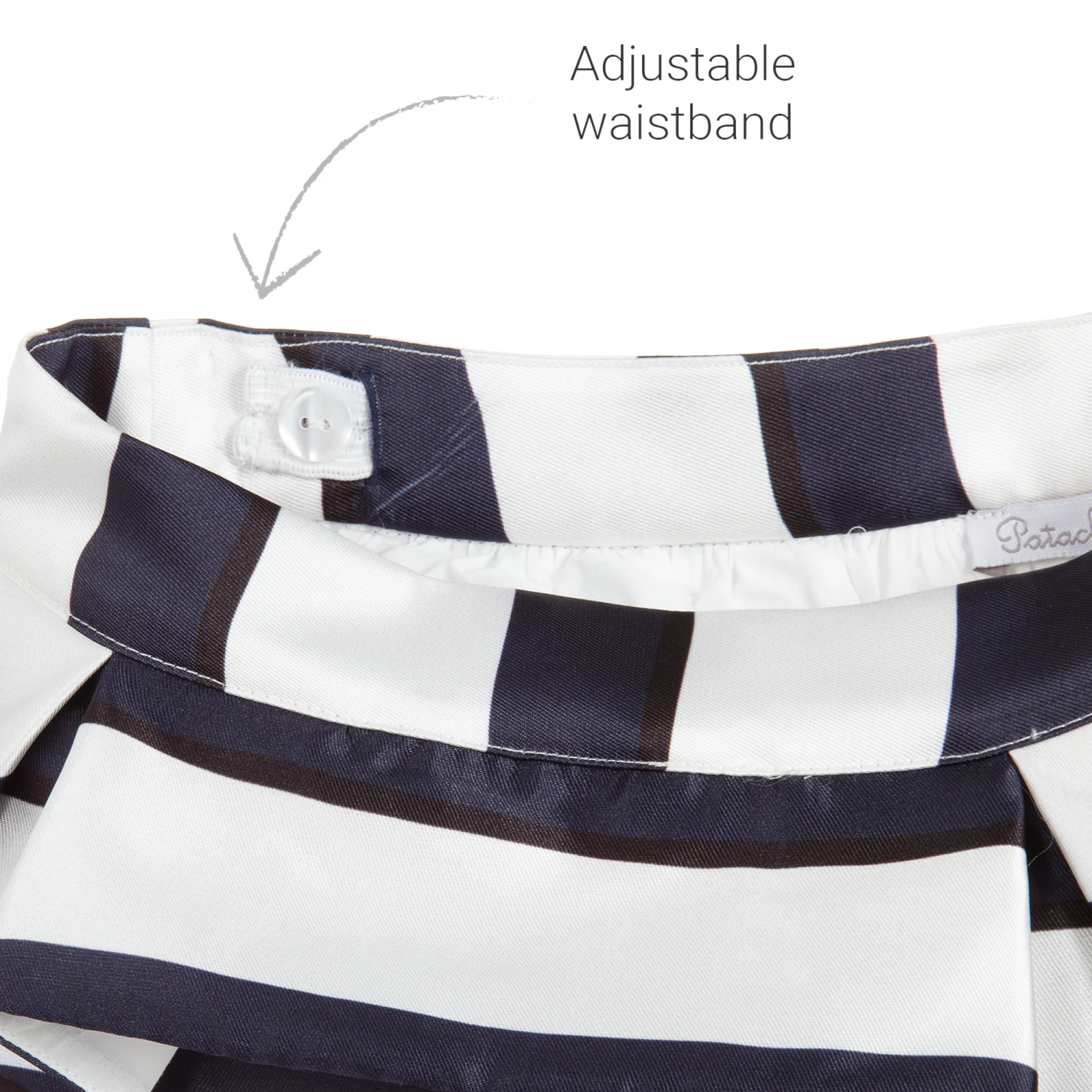 Girls smart blue and white stripe skirt from Patachou, made in lightweight satin. The pleated skirt has a short pleated layer around the waist and a lightweight cotton lining with tulle trim for extra volume.