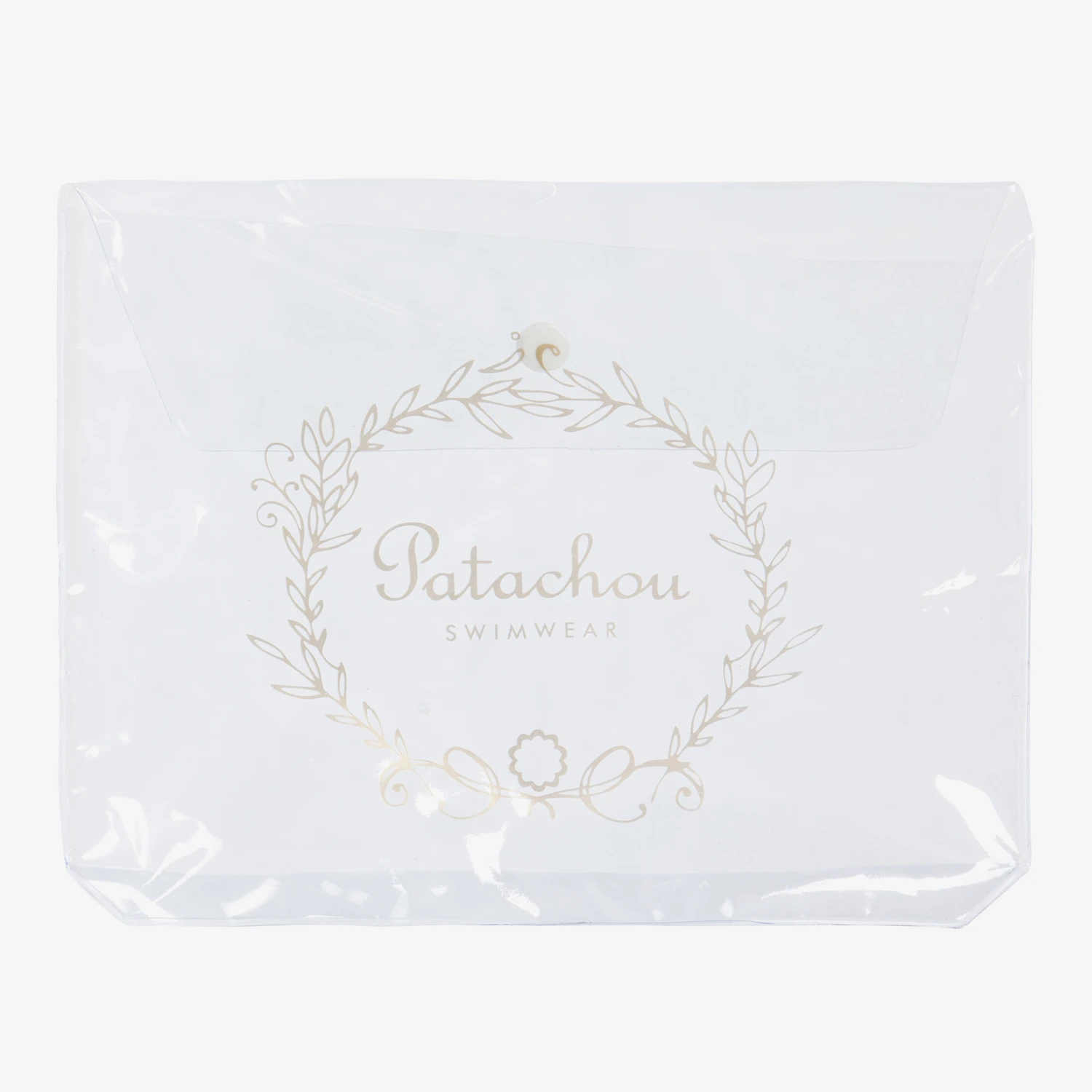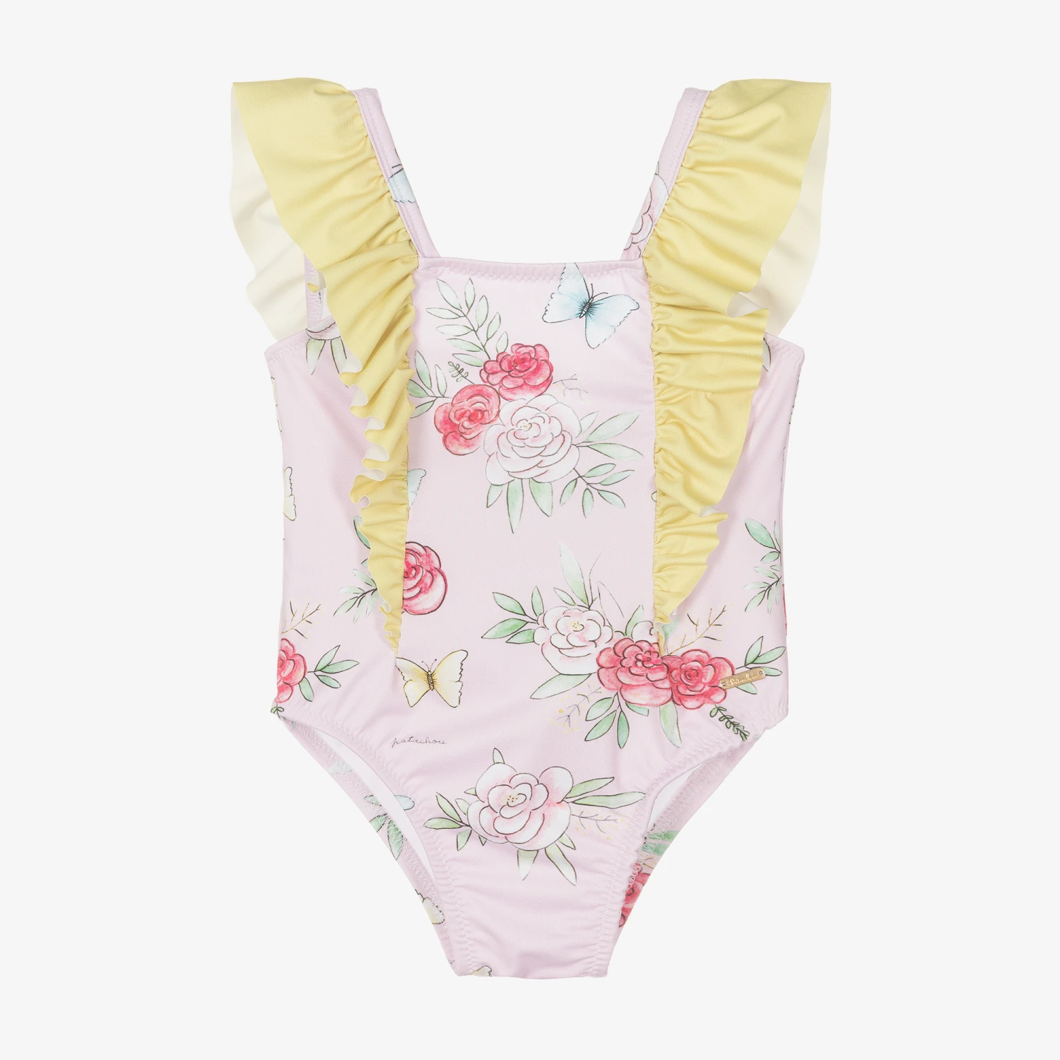 Pink swimsuit for girls from Portuguese brand Patachou. It has a pretty floral print with colourful butterflies and the brand name discreetly signed for a designer touch. Fully lined for added comfort, it is silky and stretchy for easy dressing and a better fit. It is finished with yellow frills over the shoulders and a large bow on the back.