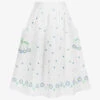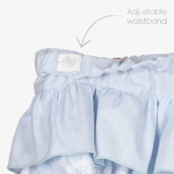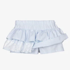 Girls light blue lace-trimmed skort by Phi Clothing. Made in soft Oxford cotton, there are multi-layers, with a white lace trim and a big bow on the front. The waistband is elasticated and adjustable and there are attached ‘shorts’ underneath.