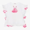 Light pink bikini for girls by Phi Clothing, patterned in a playful red heart print. Soft and stretchy, the bikini top has a shirred bodice with contrast ruffle trims. The straps tie into bows on the shoulder for a feminine look. Fully lined, the matching bottoms have layered ruffles on the front and back with self-tie fastenings on the hips.