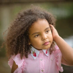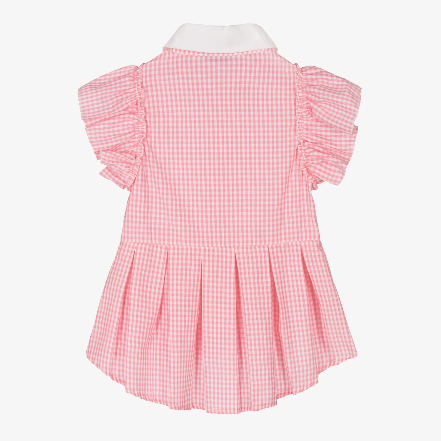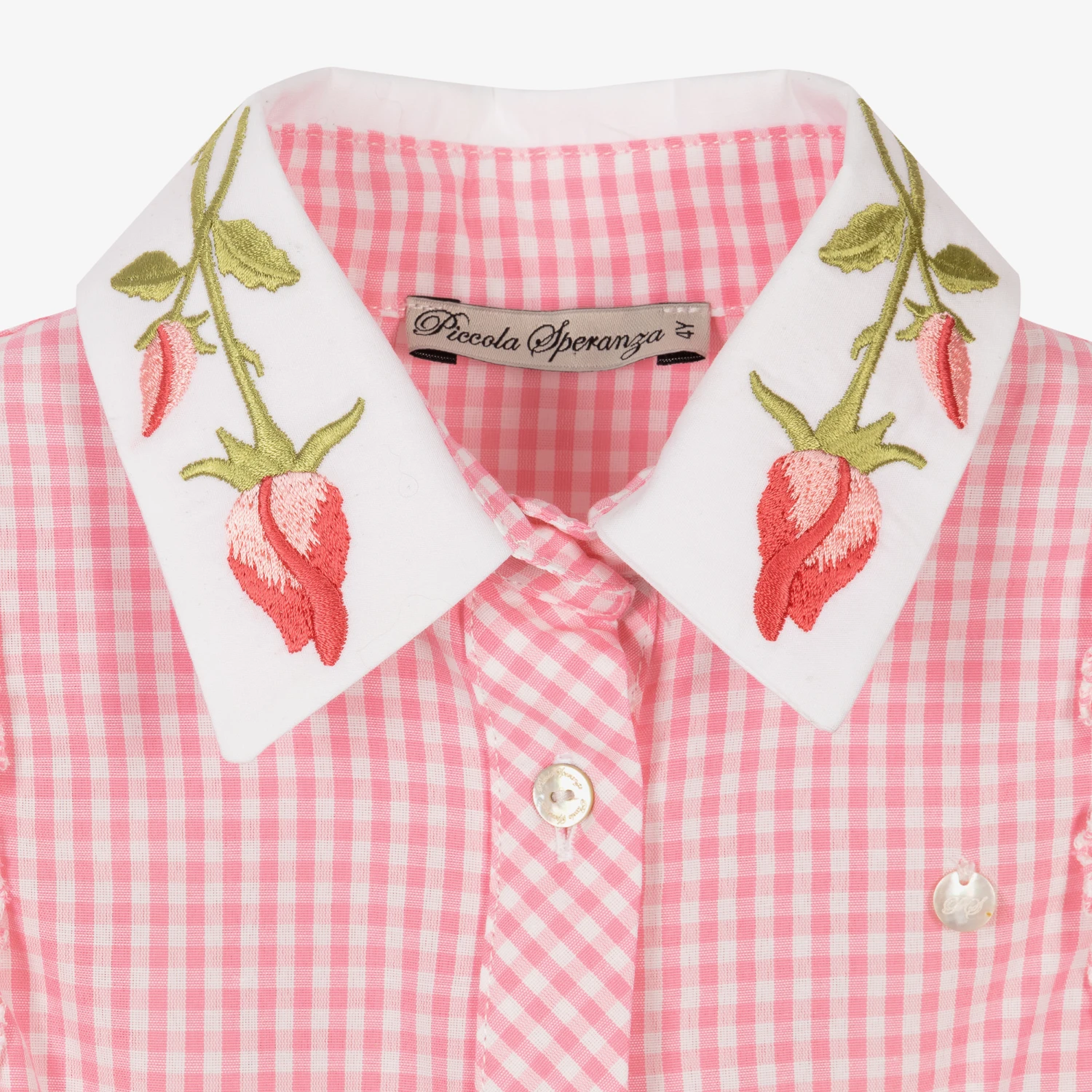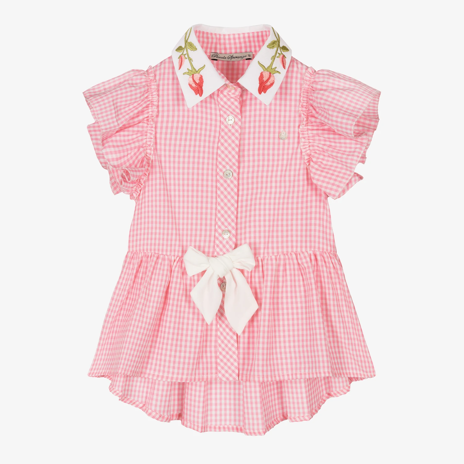 Girls pretty pink and white gingham check blouse from Piccola Speranza, in soft cotton poplin. It has a white collar, beautifully embroidered with pink and green roses, lovely flutter sleeves and a fixed white bow on the front. Longer length at the back with pretty box pleats, the peplum hem is gathered on the front. It fastens with mother-of-pearl buttons on the front.