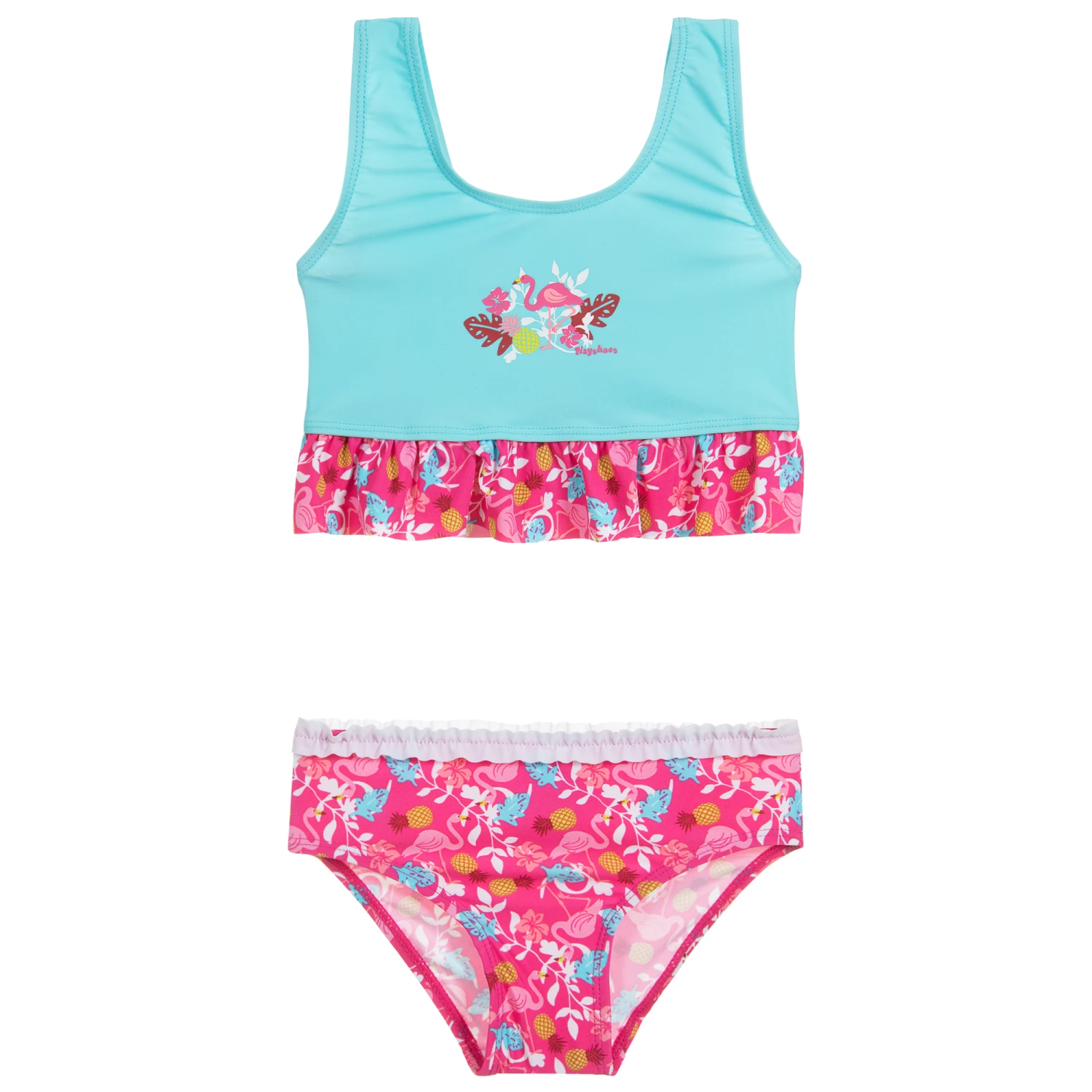 Girls turquoise blue and pink bikini by Playshoes, with a sun protection factor of 50+. Silky soft and stretchy, the blue top has a flamingo logo print with a pink tropical flamingo print frill to match the bottoms.