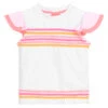 Girls turquoise blue sun protective suit by Playshoes, with a pretty pink flamingo print on the chest and matching pink sleeves and frills. This soft and stretchy suit has a sun protective factor of 50+, with a zip fastening down the front.