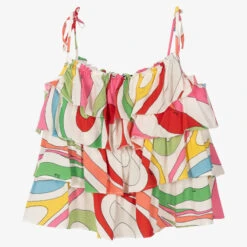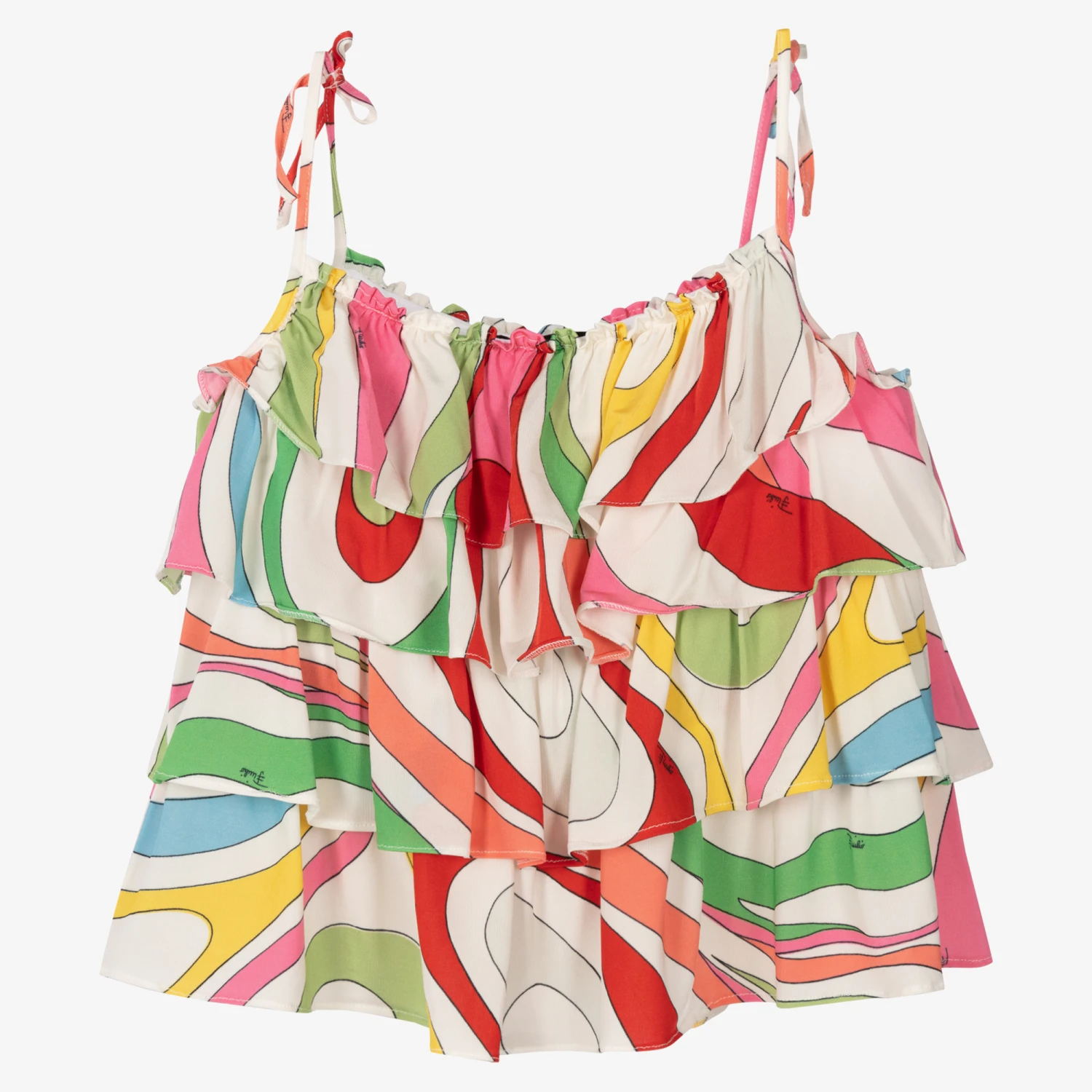 Beautiful white top for girls from Emilio Pucci. Silky and smooth, it is printed in a bright geometric Marmo print with layered tiers creating a fun silhouette. The thin straps are tied in bows on the shoulders for a pretty finish.