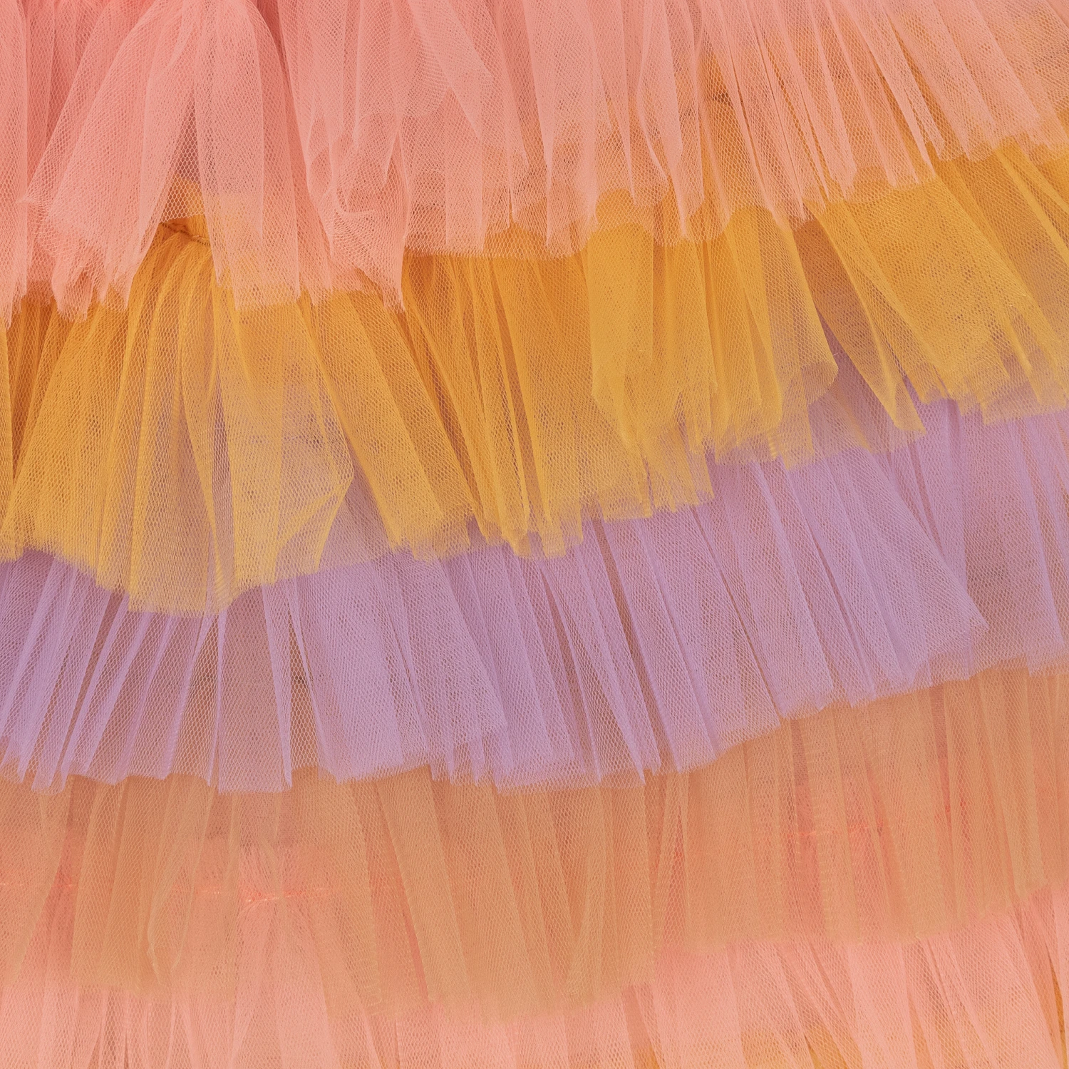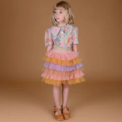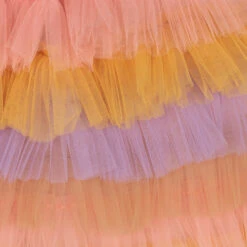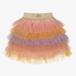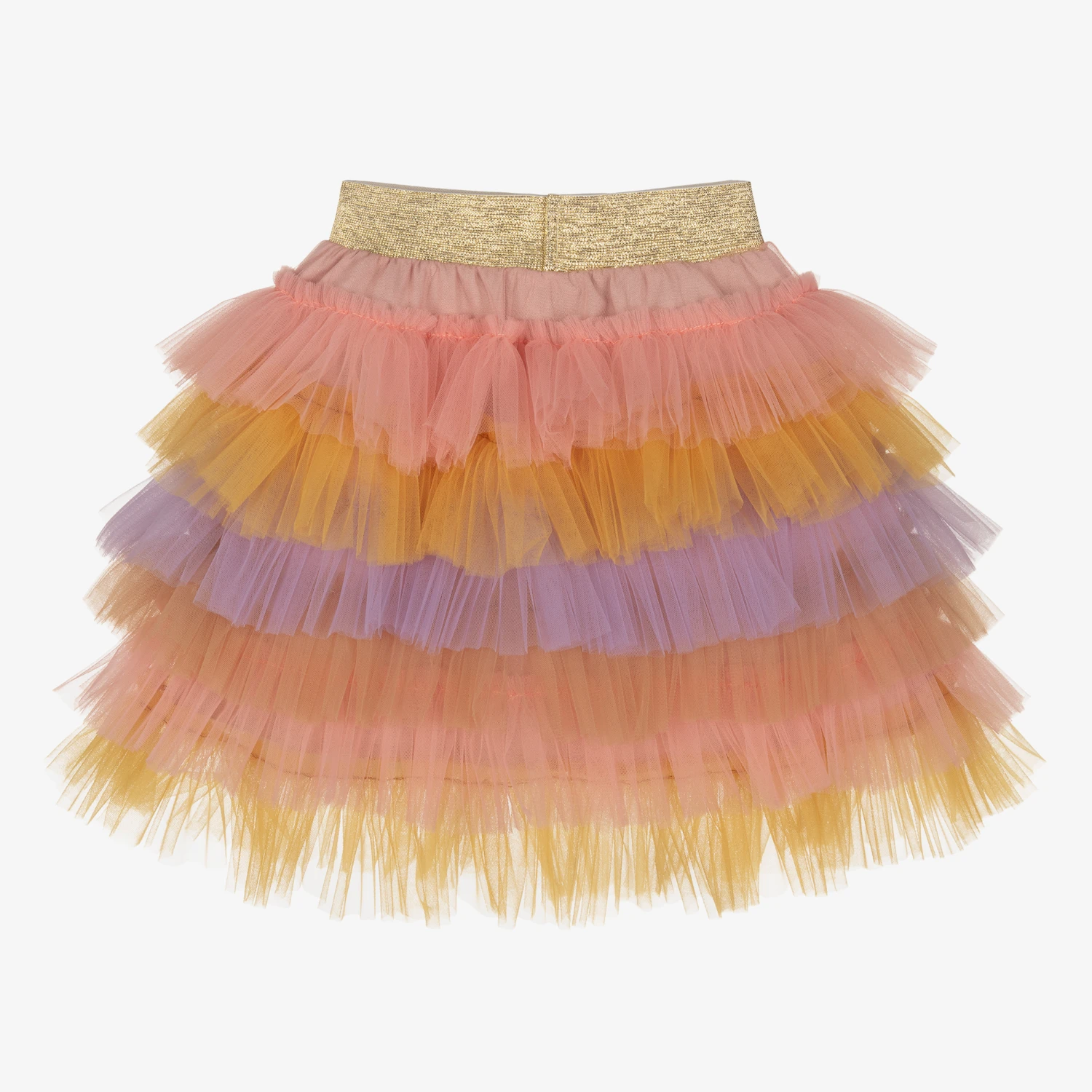 Girls pastel tulle skirt by London-based designer, RaspberryPlum. The tiered layers are in shades of pink, yellow and lilac on a pink background, with a stretchy gold glitter waistband and viscose lining for comfort.