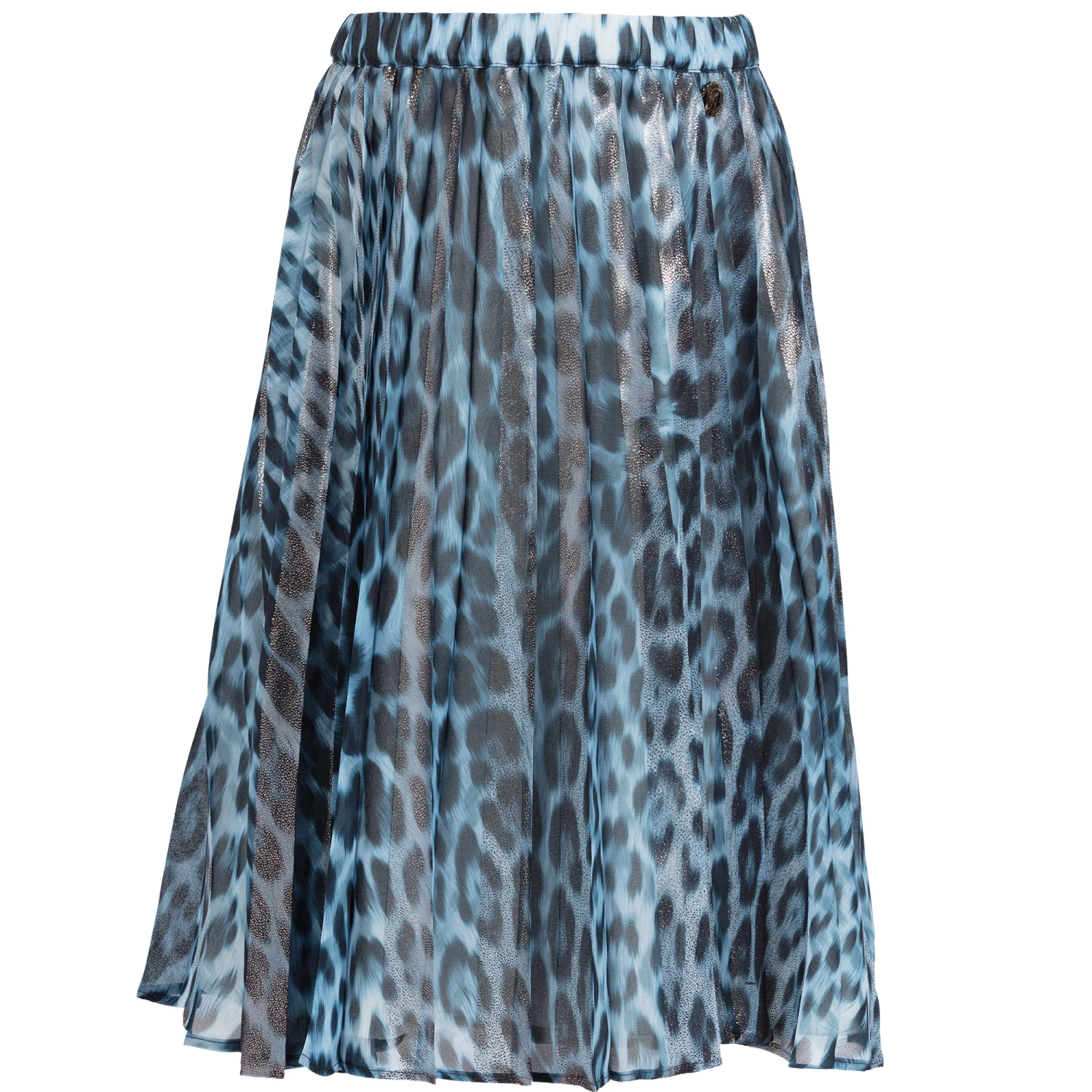 Mini-me, mid-calf length skirt for girls by Roberto Cavalli, made in blue, leopard-print chiffon with a shimmering silver stripes. Pleated, it is lined in ivory satin and has a comfortable elasticated waistband with a silver metal logo charm sewn below.
