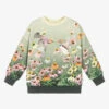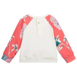 Girls pink and ivory cotton sweatshirt by Roberto Cavalli. Fastening at the back with buttons it has a fun print of flowers, a leopard and butterflies.