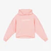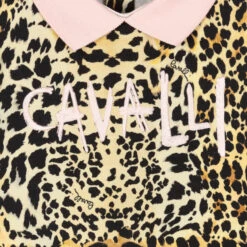 Beige and black leopard print sweatshirt for little girls by luxury designer Roberto Cavalli. It is made in soft cotton jersey and has pink ribbed trims. There is pink logo embroidery on the front, with popper fastenings on the back.