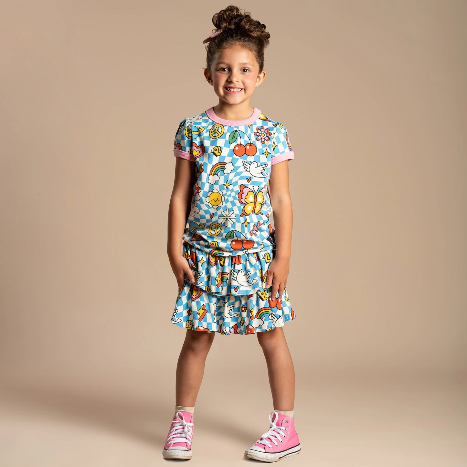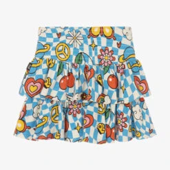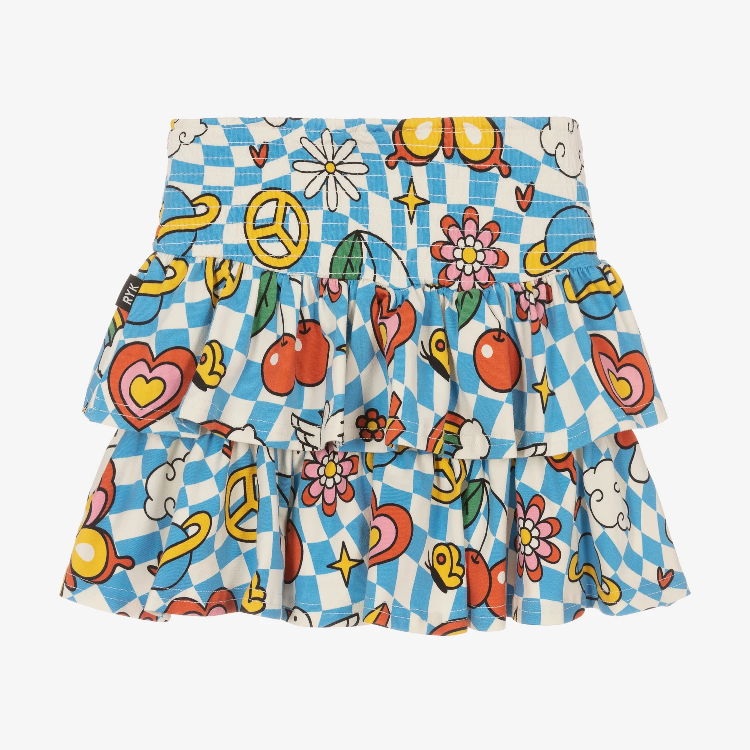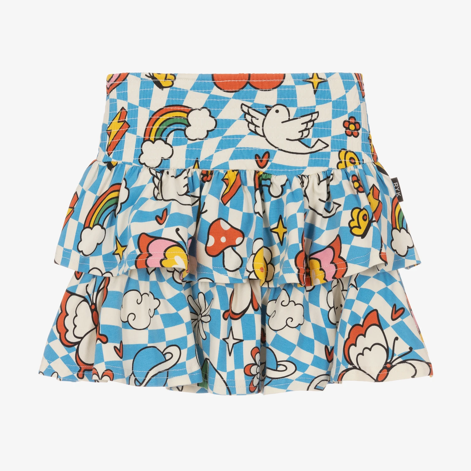 Girls blue and ivory check skirt by Rock Your Baby, made in soft cotton jersey. It has a fun cartoon sunshine, clouds and rainbows print all-over. The waist is shirred for comfort and style, and it has tiered ruffles for a girly finish.