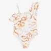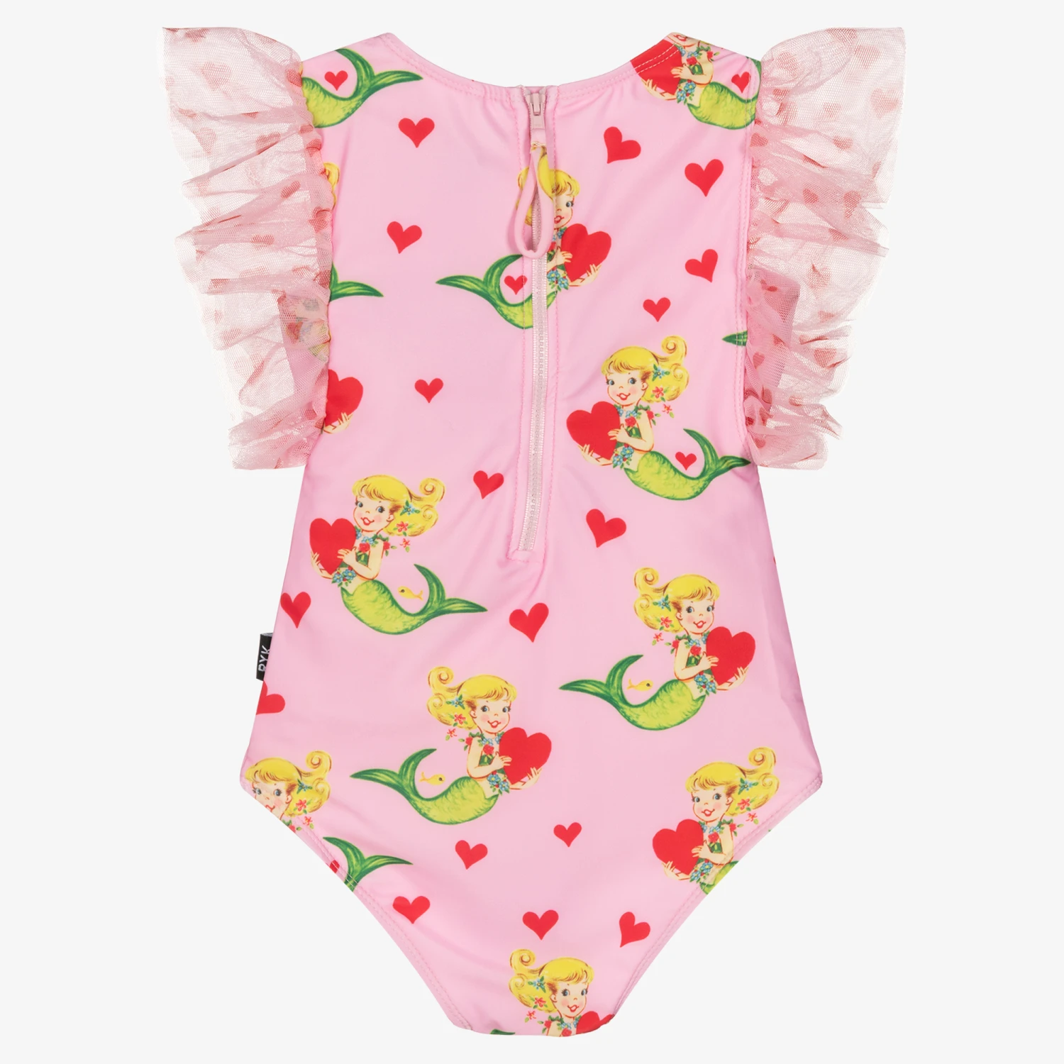 A pink swimsuit for girls by Rock Your Baby, made from smooth and stretchy recycled materials. This swimsuit is patterned in mermaids with red love hearts for a playful, retro-inspired style. There are pretty ruffled tulle sleeves, with a subtle tag logo attached to the side. The useful zip fastening and breathable lining offer comfortable wear.