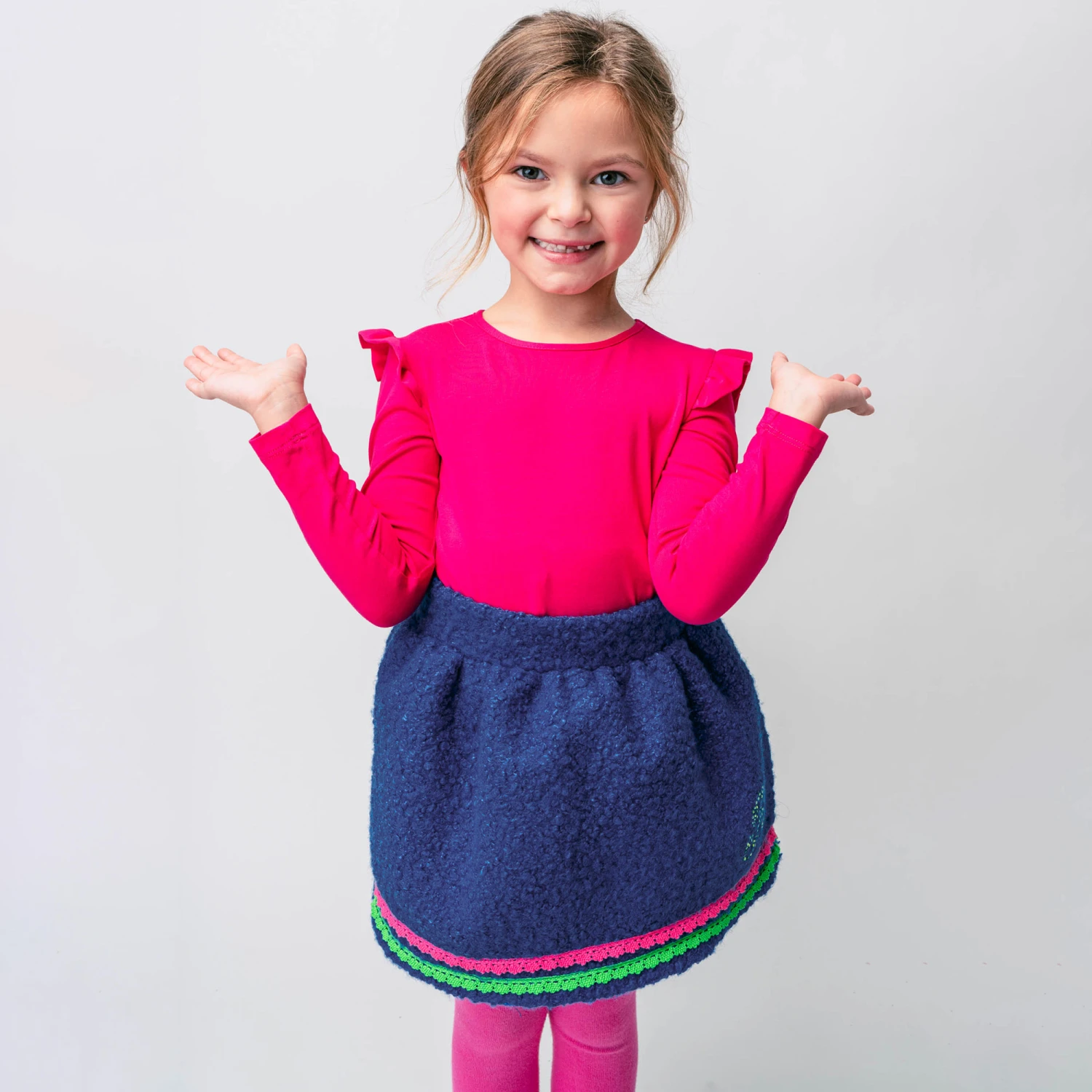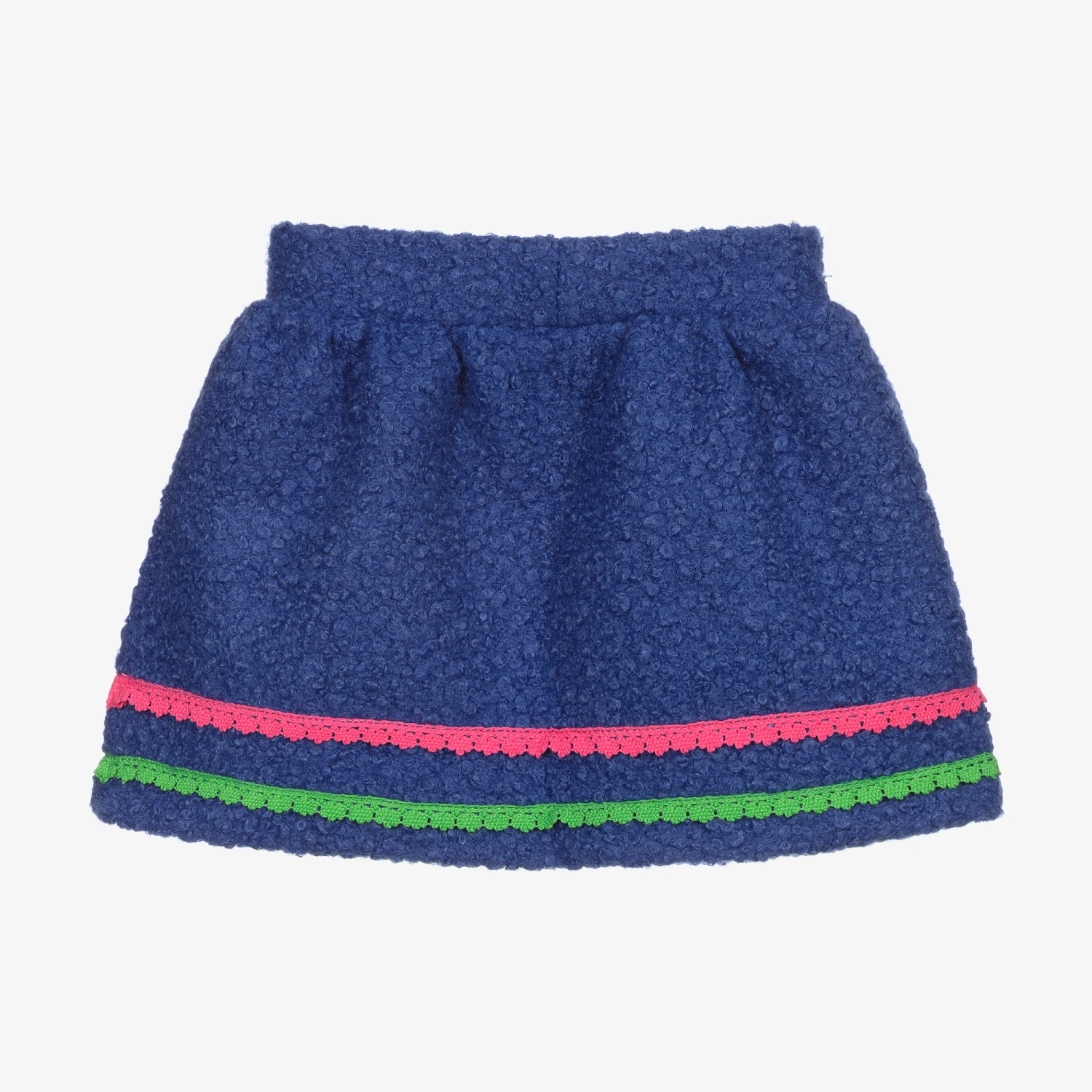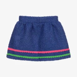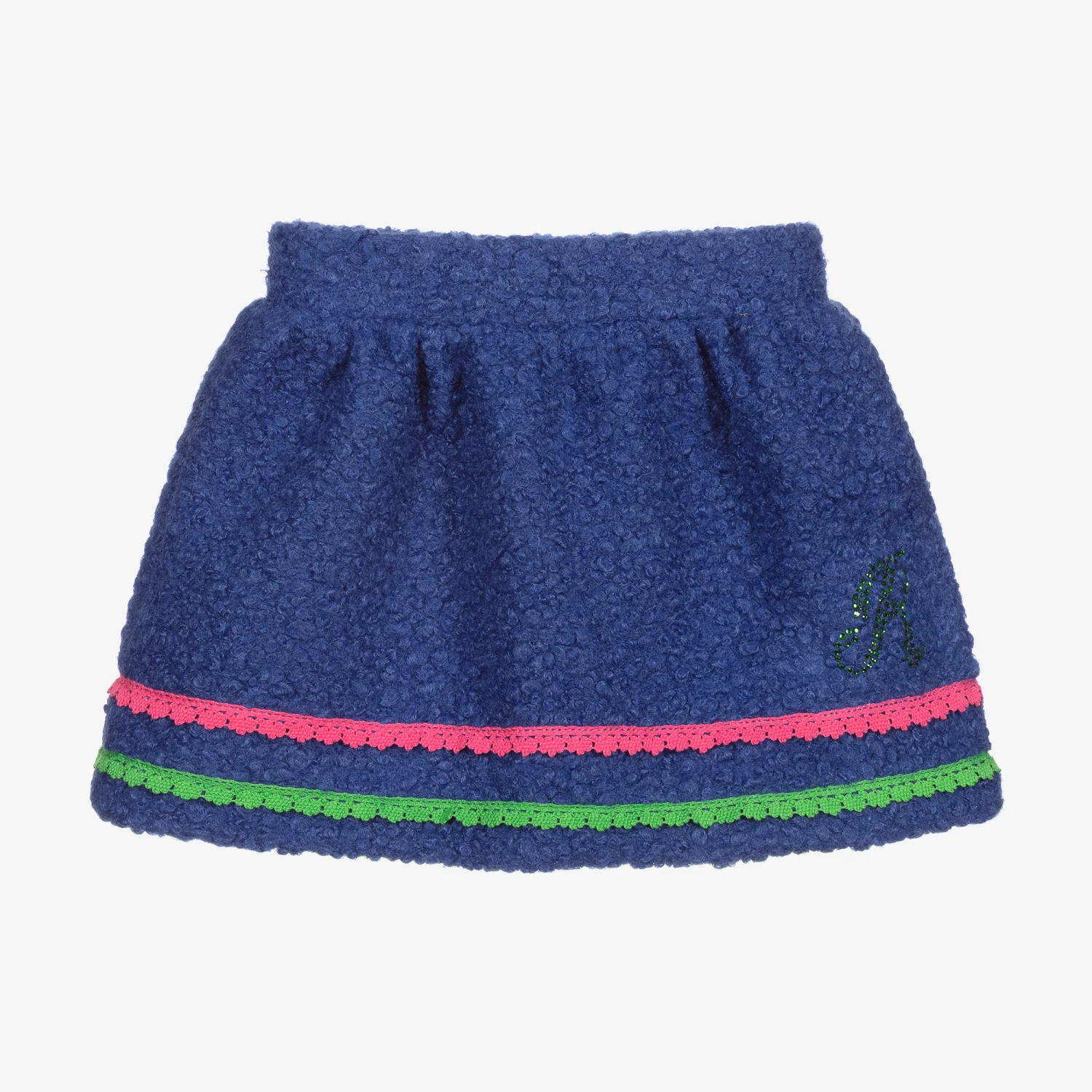 Blue bouclé skirt for girls by Rosalita Senoritas, with pink and green lace trims. This fun skirt has an elasticated waistband, with a green diamanté ‘R’ logo on the side.