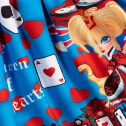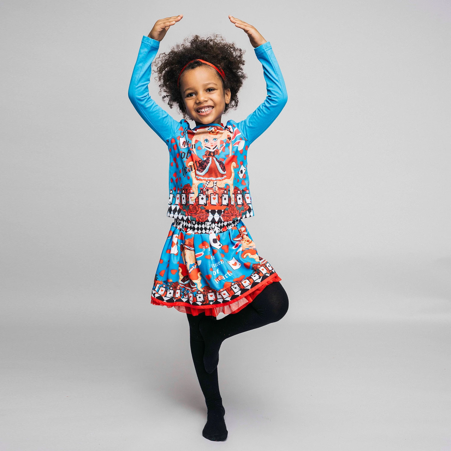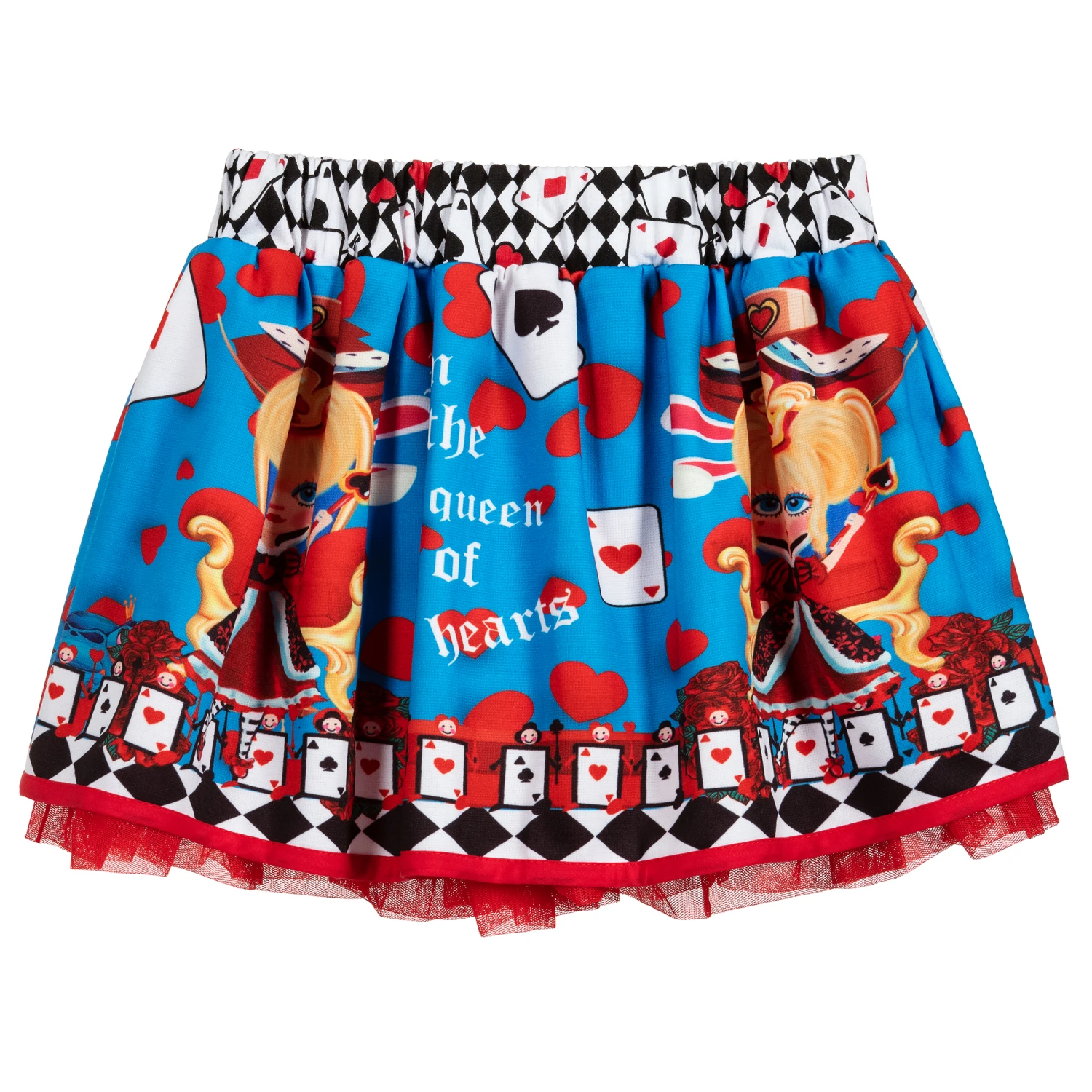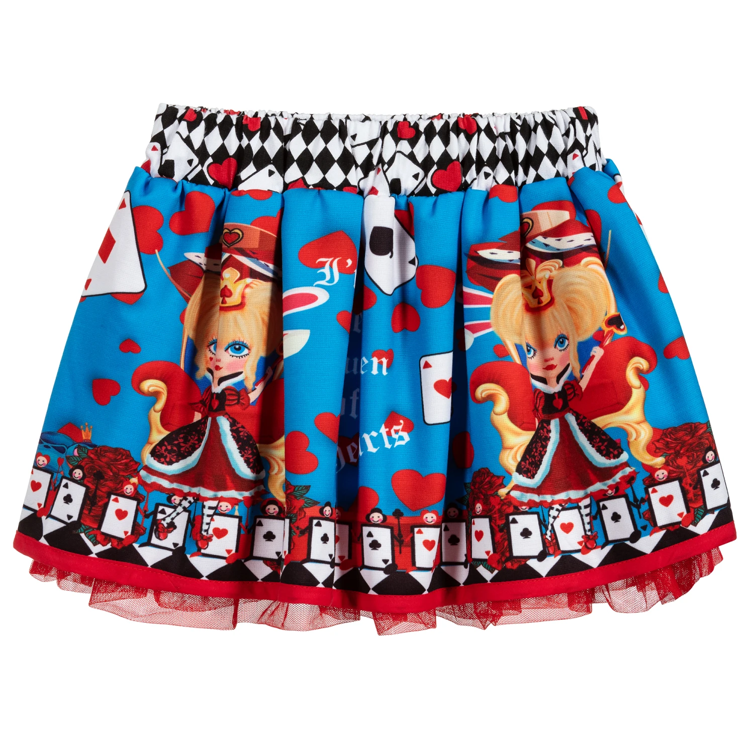 Girls blue skirt by Rosalita Senoritas, with a fun Queen of Hearts playing card print. Made in comfortable jersey, it has a lightweight cotton lining with red tulle frills to give extra volume.
