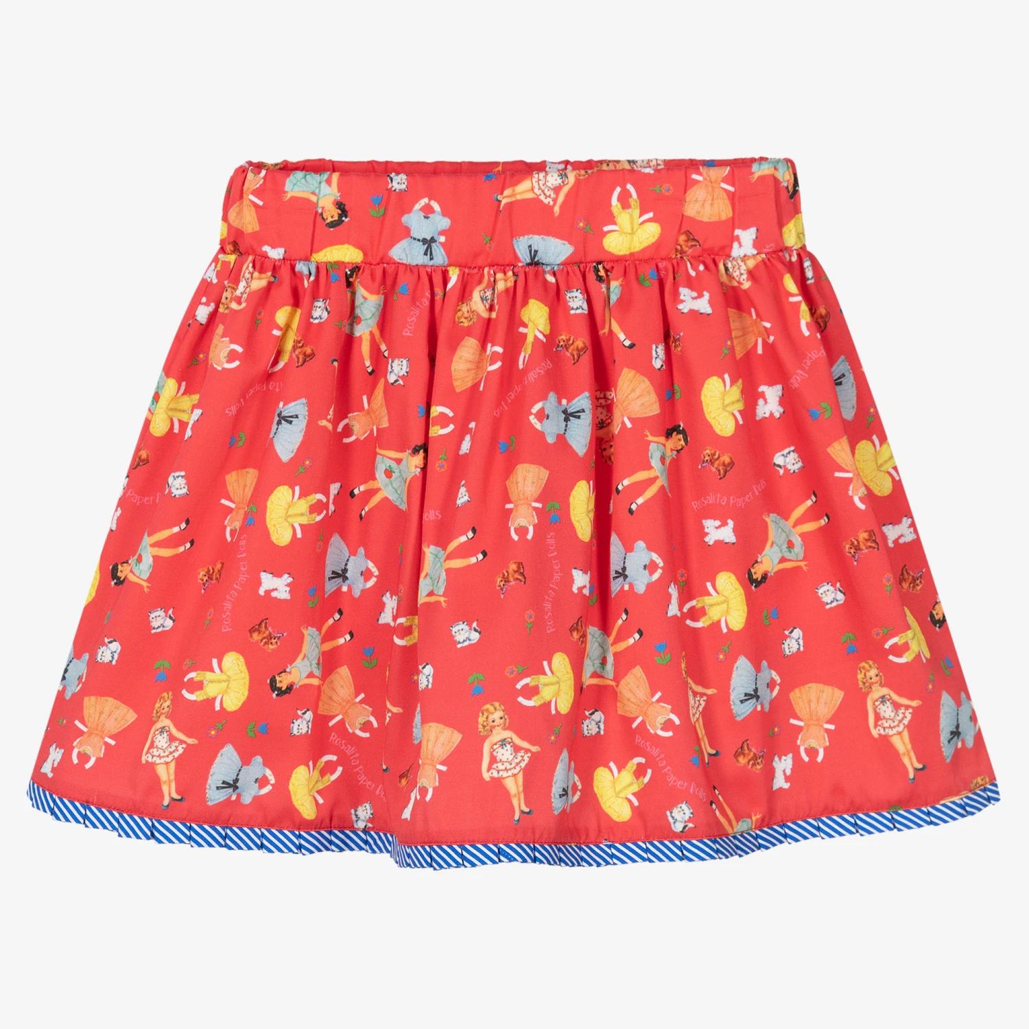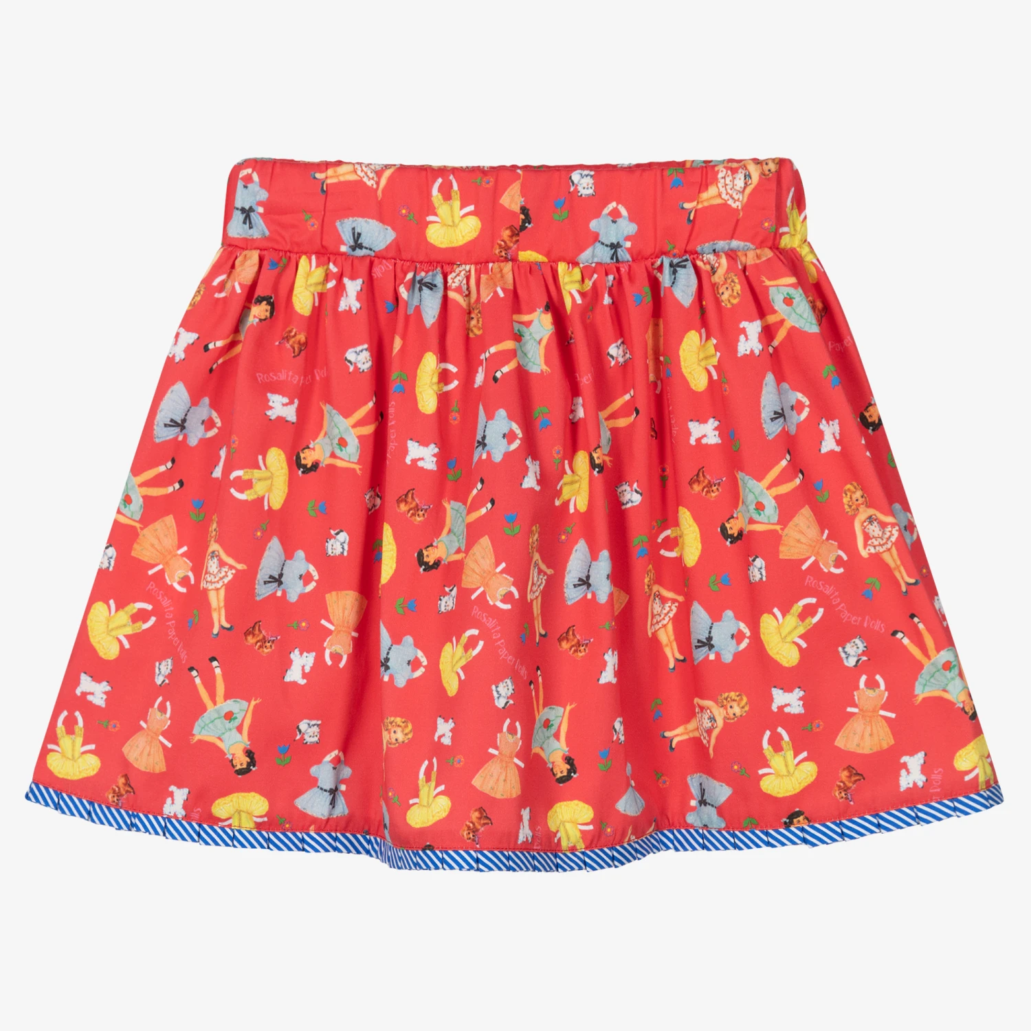 Coral red skirt for girls by Rosalita Senoritas, with a colourful dress-up paper doll print. Soft, lightweight and breathable, it has a comfortable elasticated waistband and the hem has striped, pleated trim in blue and white.