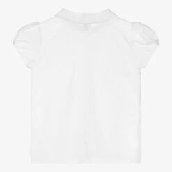 White broderie anglaise blouse for girls by Sarah Louise, made in lightweight polycotton. It has blue and white striped trim on the rounded collar and pretty puffed sleeves.