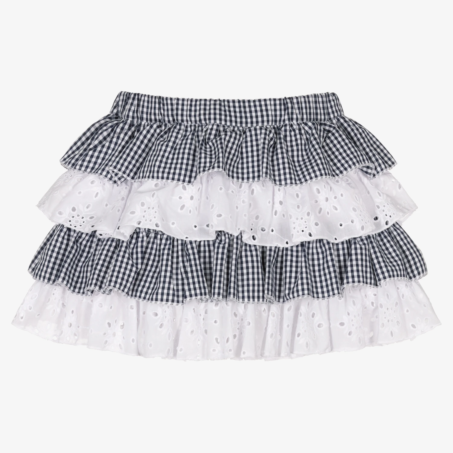Lovely cotton skirt for girls by Selini Action, made in voile with frills of navy blue and white gingham and white cut work voile between. Exclusive to Childrensalon and handmade, it is lined in cotton voile and has a comfortable, elasticated waist, ideal for little tummies. Easy to wear, it simply pulls up.