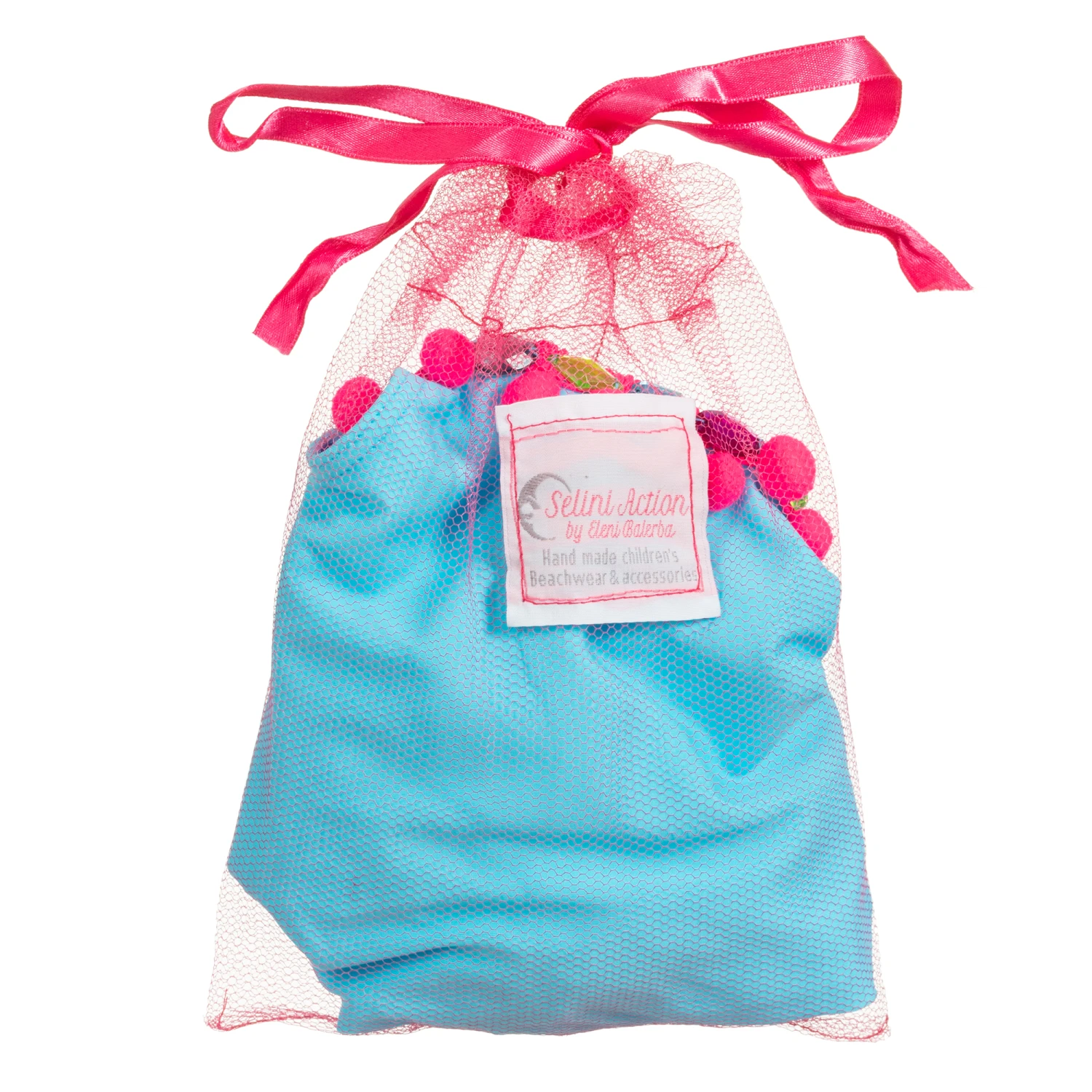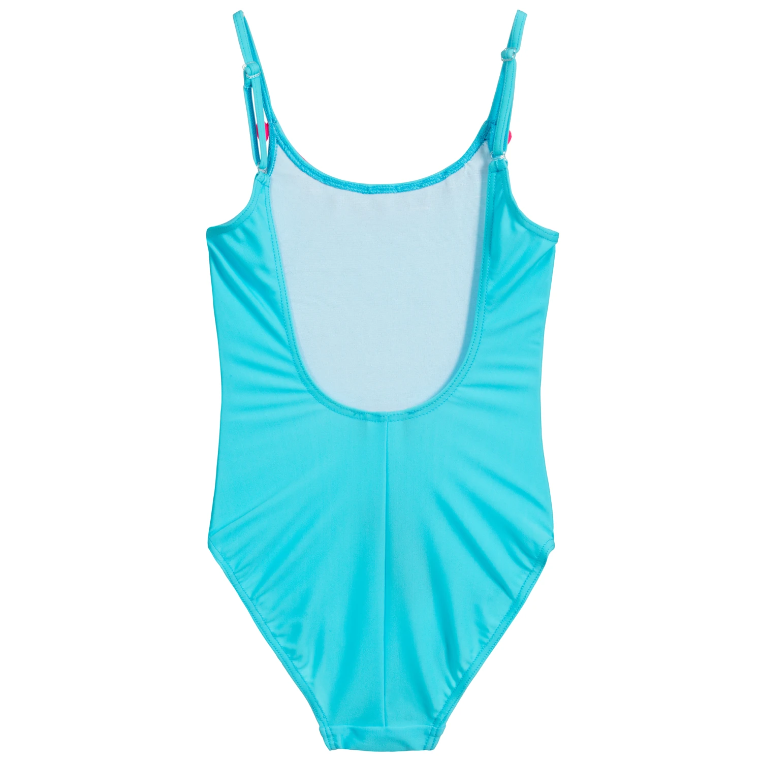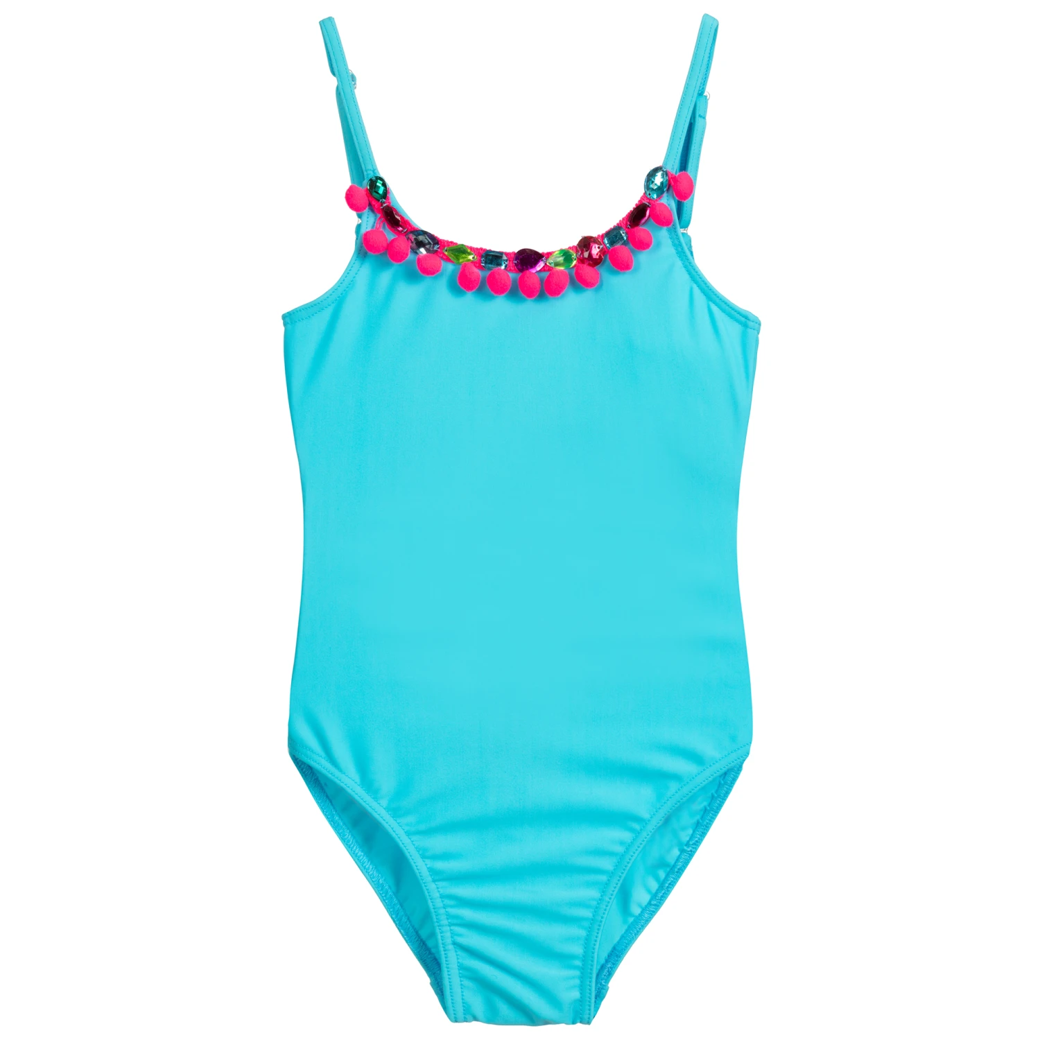 Girls turquoise blue swimsuit by Selini Action, with a neon pink pom-pom and bright jewelled trim around the neck. It is lined at the front and has adjustable shoulder straps.
