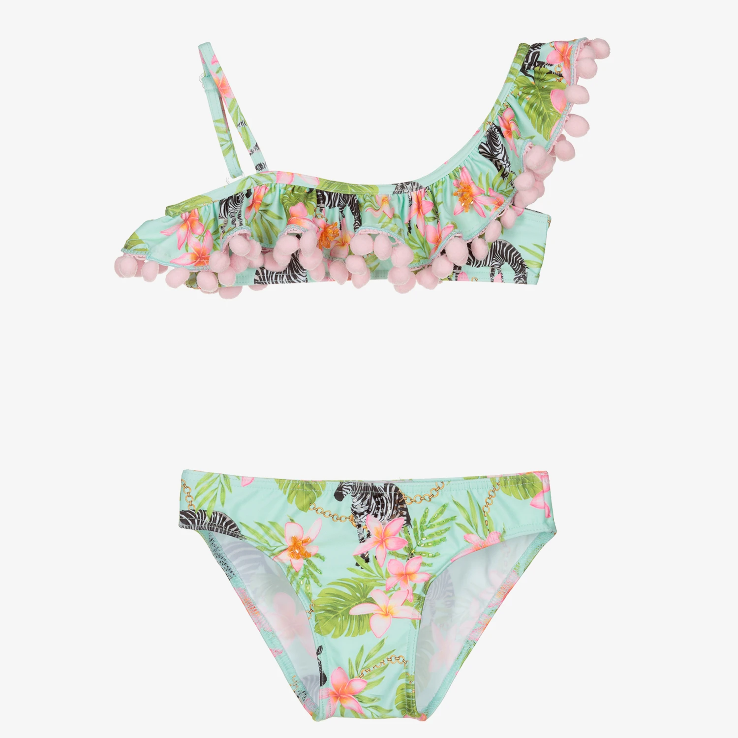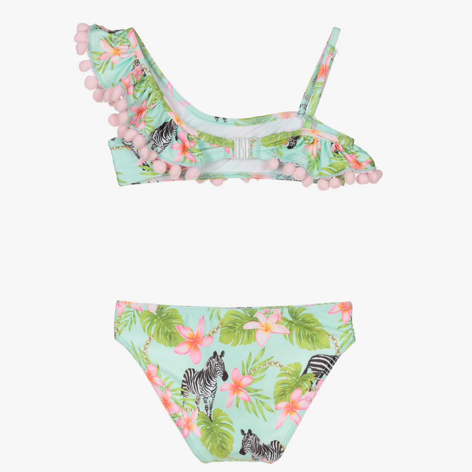 Bold mint green bikini for girls by Selini Action, made in soft and stretchy polyester and lined with nylon. It has beaded detailing and a sweet print consisting of palm leaves, flowers and zebras. The top fastens with a clasp on the back and has adjustable shoulder straps, trimmed with pink pom-poms.