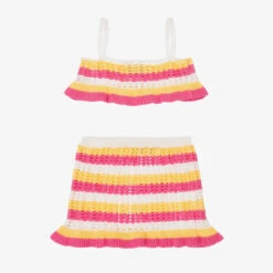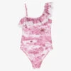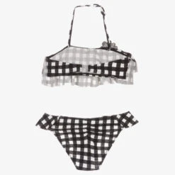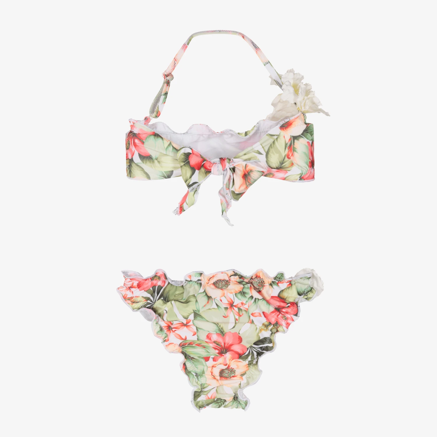 Beautiful bikini for girls by Selini Action, patterned with a tropical pink and green floral print on a white background. Silky and stretchy, the bandeau-style top ties at the back and has an adjustable halter neck strap. For a pretty finish, both pieces have elasticated ruffle trims and are decorated with exquisite handmade ivory flower appliqués.