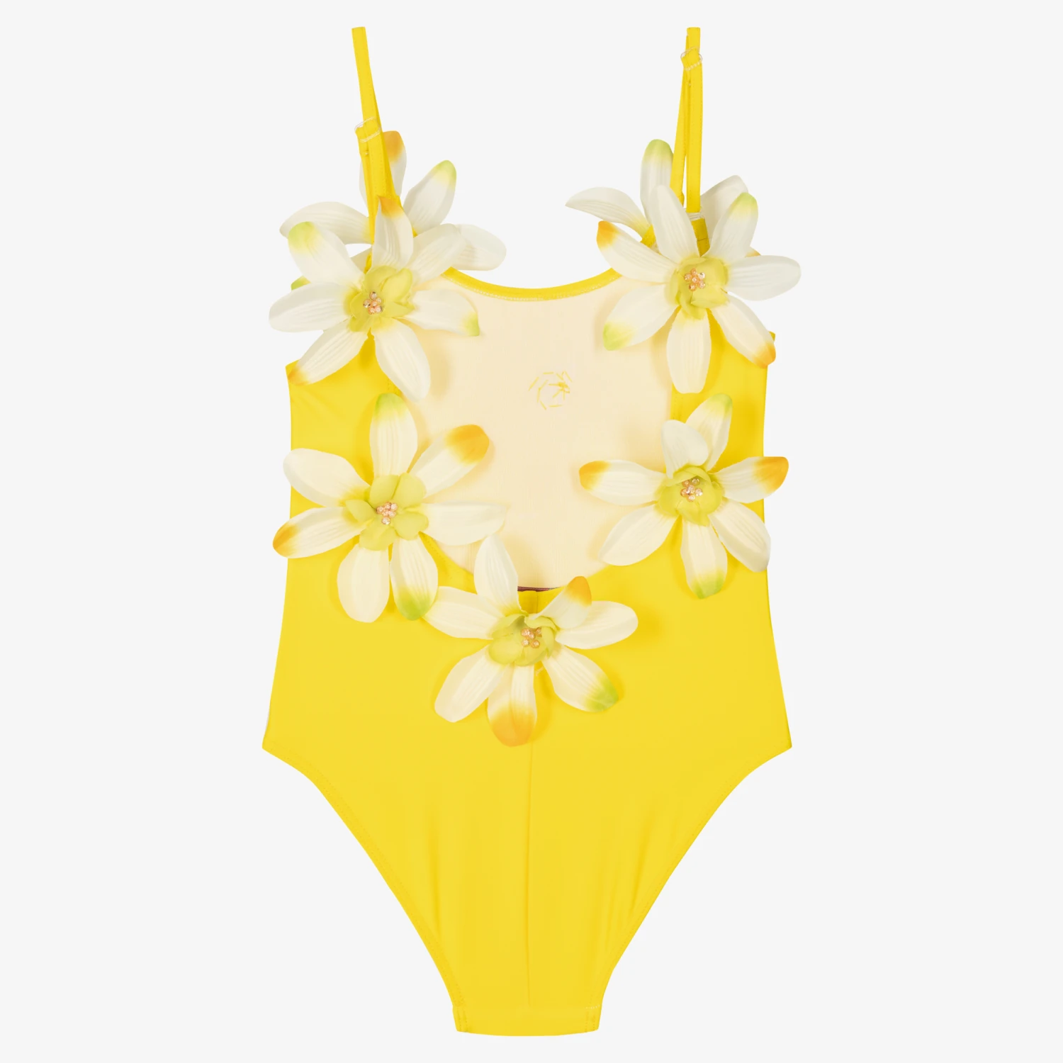 Glamorous yellow swimsuit for girls by luxury brand Selini Action, exclusive to Childrensalon. Soft, silky and handmade, it has yellow and green lily appliqués around both the front and the low back, with shimmering sequinned and beaded centres. There are useful, adjustable shoulder straps and a front lining for comfort.