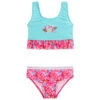 Grey and white striped bikini for girls by Selini Action, with a pink strawberry print and pretty bead embellishments. Silky, stretchy and lined for comfort, the briefs have cute tie detail at the sides and the top has adjustable shoulder straps and a plastic clip fastening at the back.
