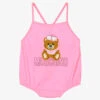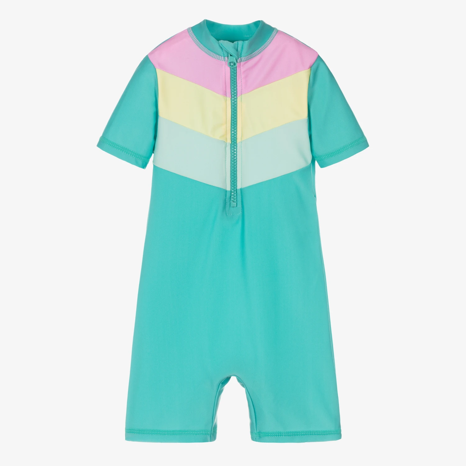 Turquoise blue sun suit for girls by British swimwear brand Soli Swim, made with UPF 50+ sun protective fabric. With pink, yellow and green chevron stripes on the chest, it features a half zip fastening on the front for easy dressing. It has a protective zip guard on the high neckline and the brand’s name on the back in white.