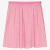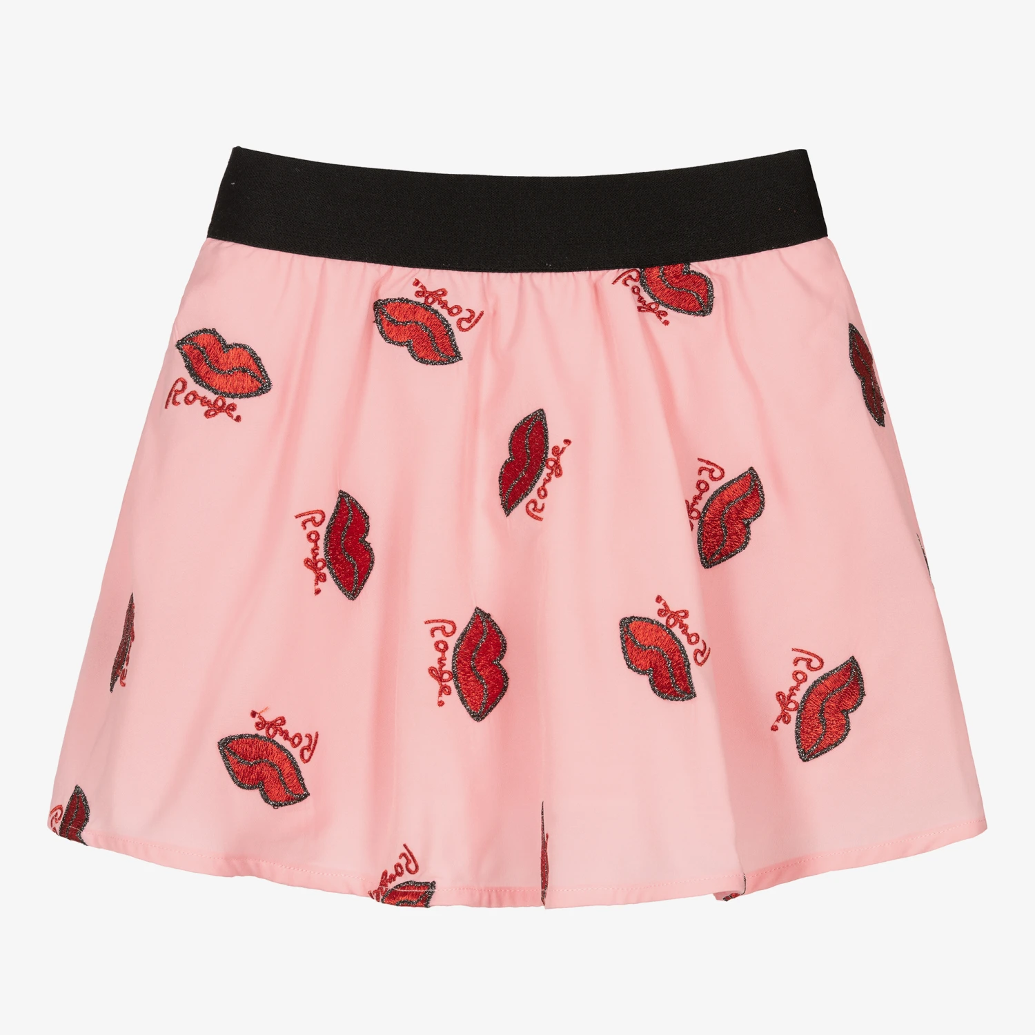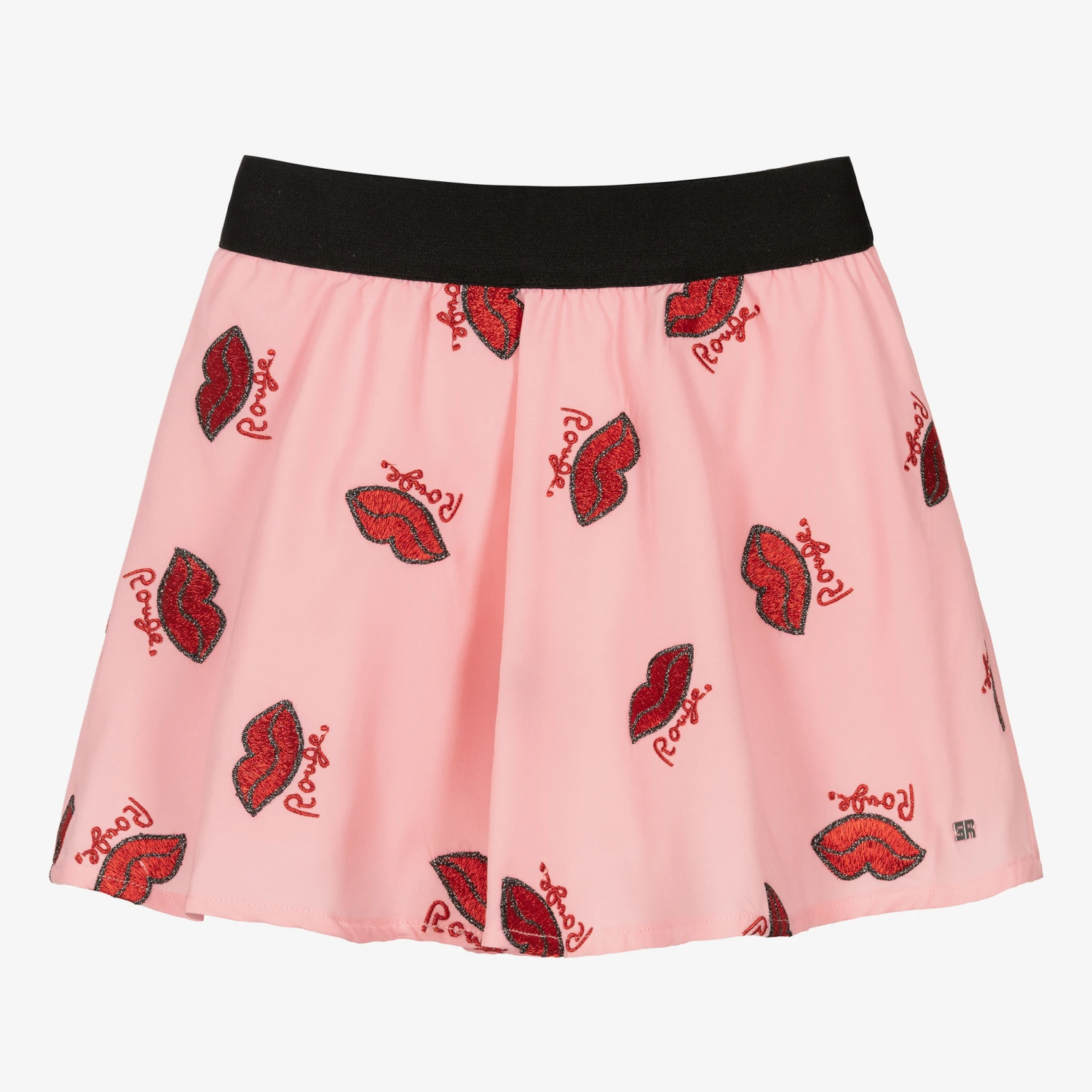 Fun pink skirt for girls by Sonia Rykiel Paris, made in soft lightweight chiffon. Creating an eye-catching statement, it is pattened with red and sprakly black embroidered lips with the word ‘Rouge’ in red. Fully lined, with an added layer of soft tulle, it has a black elasticated waistband.
