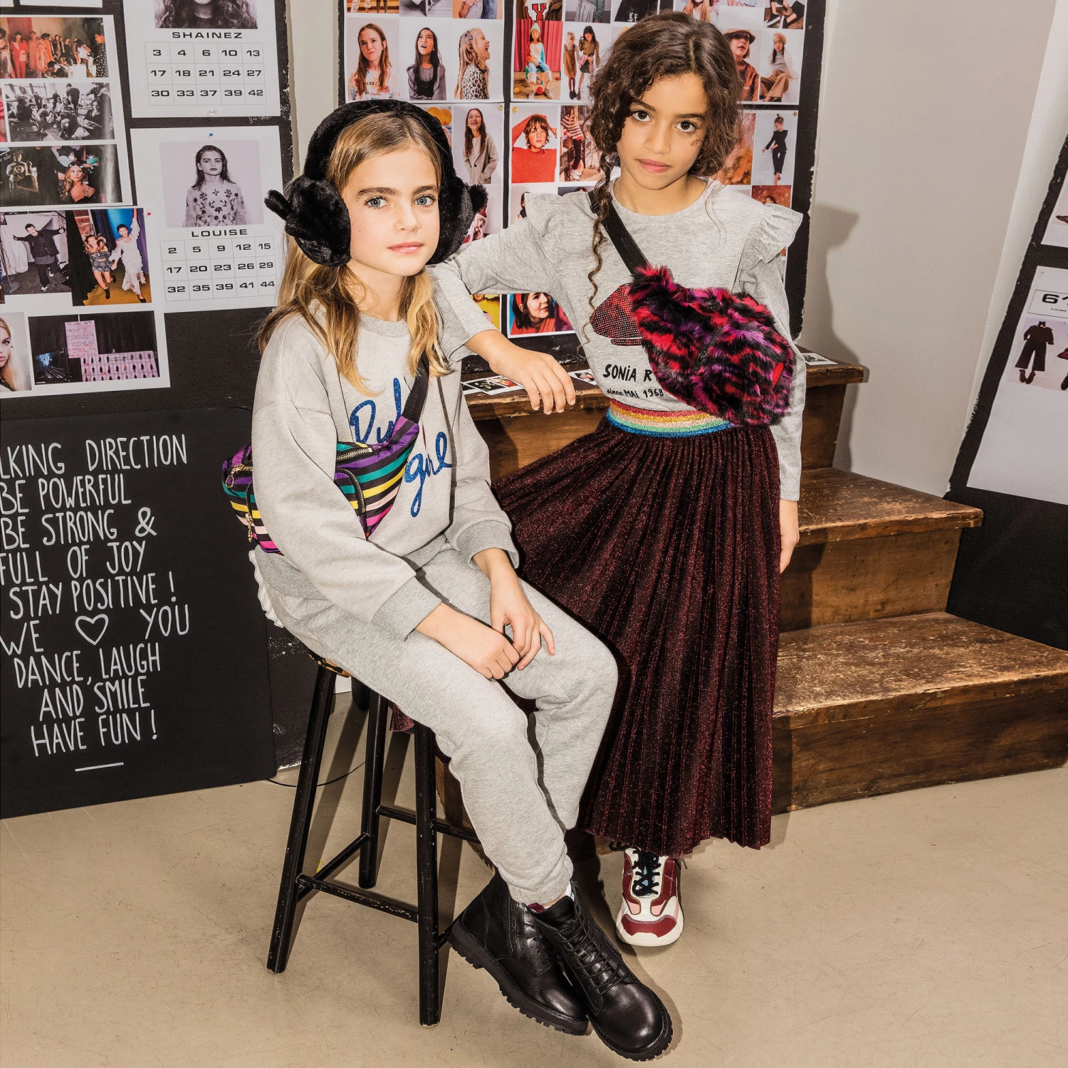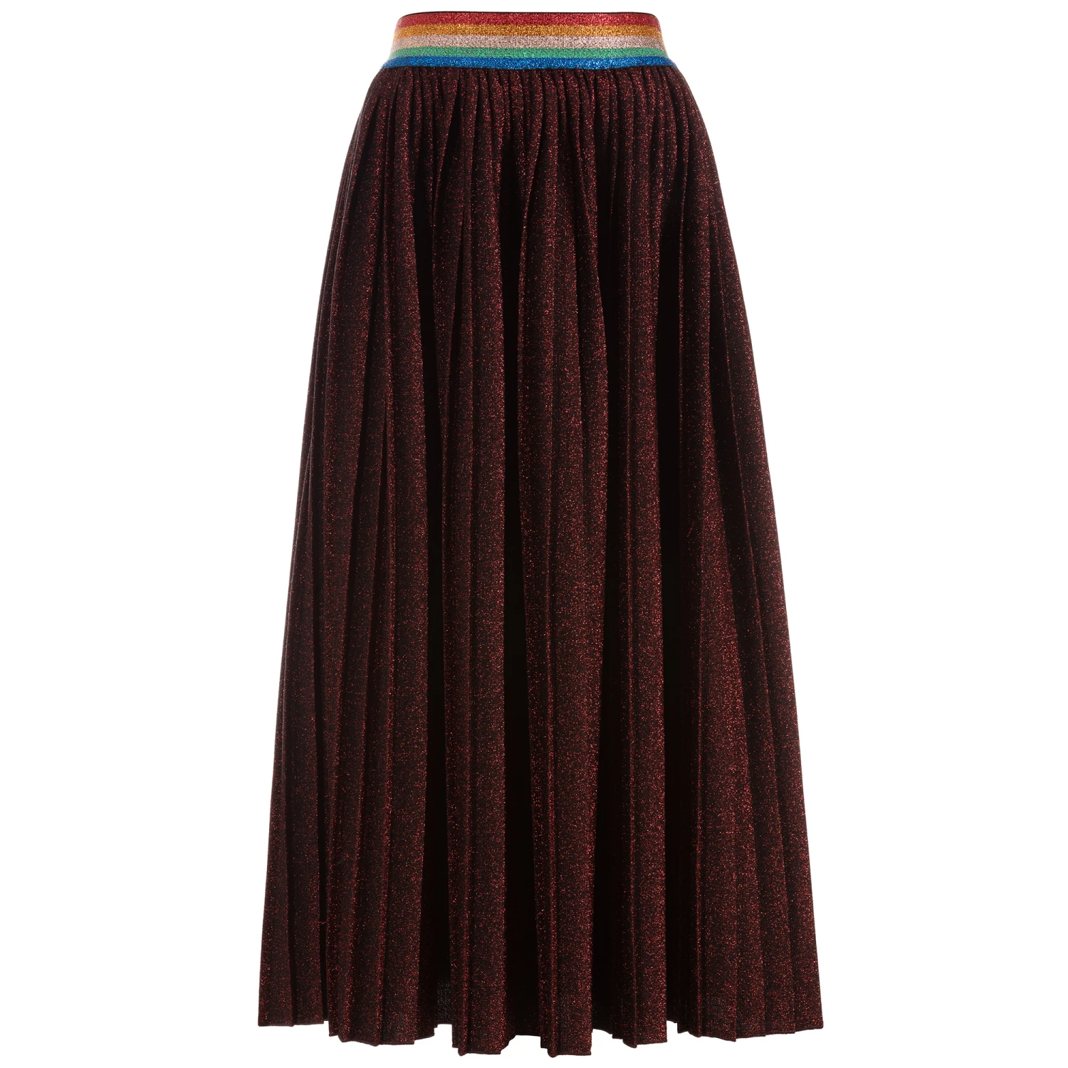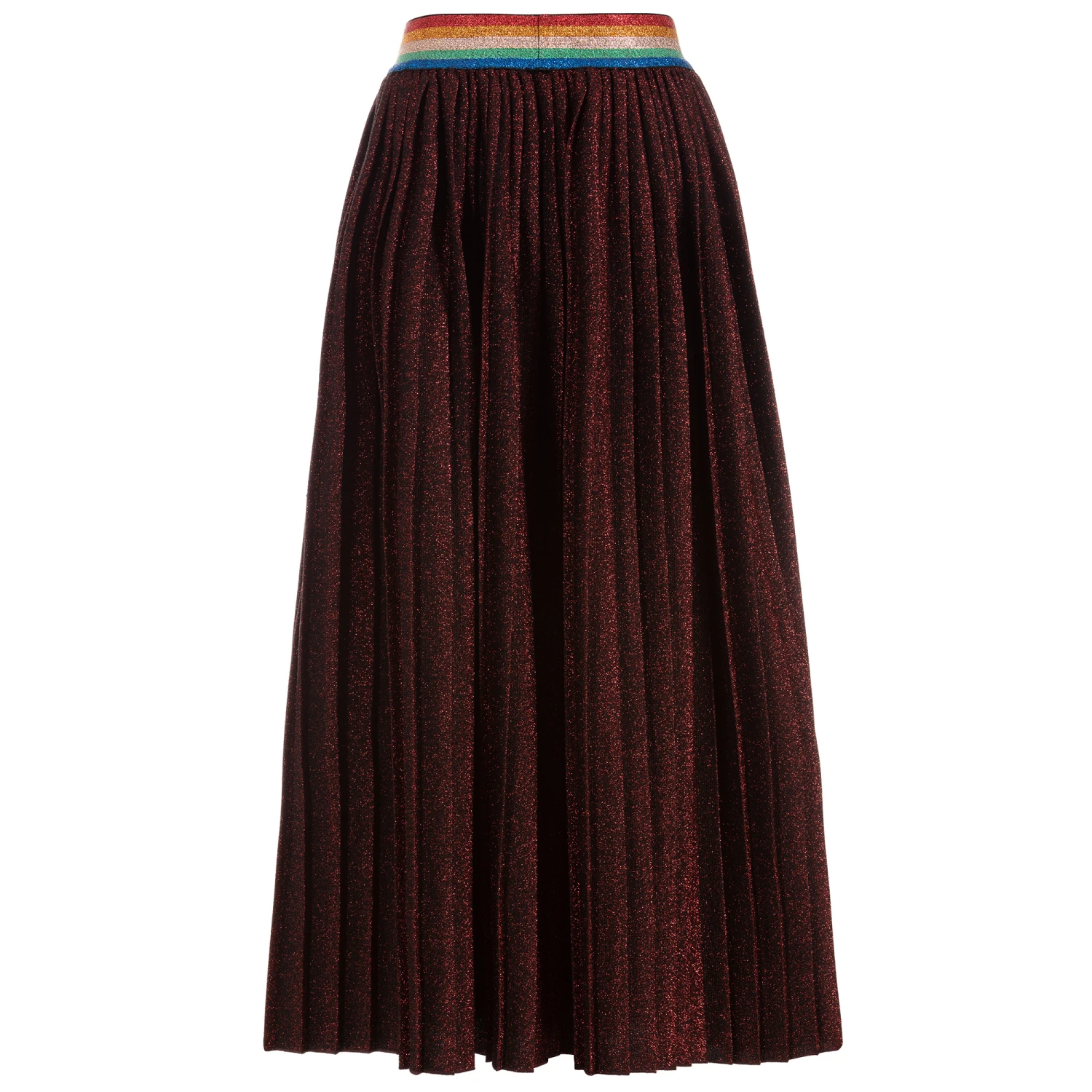 Mini-me pleated red glitter skirt for girls by Sonia Rykiel Paris, made in soft and stretchy fabric. It has a pretty elasticated waistband in colourful stripes.